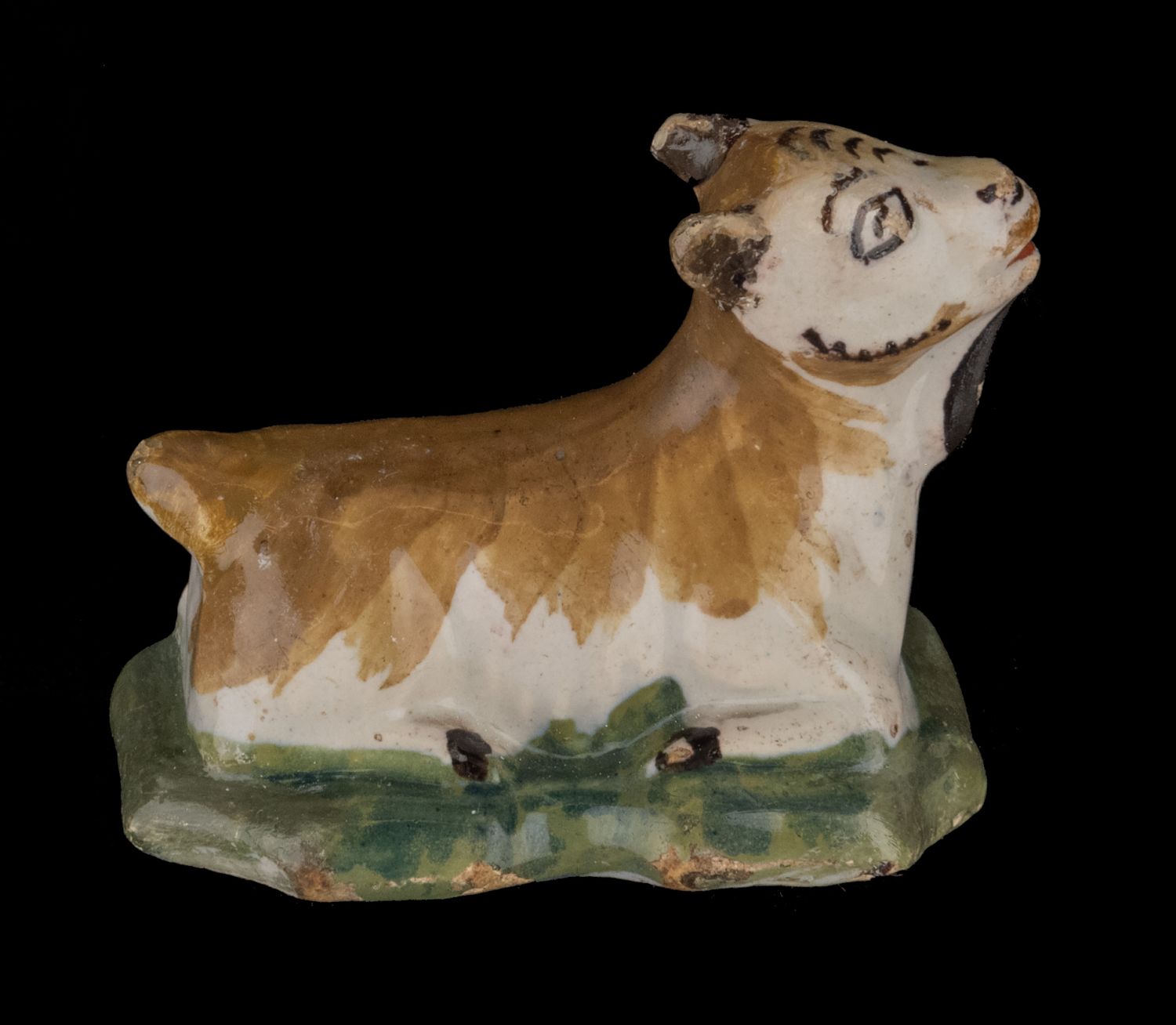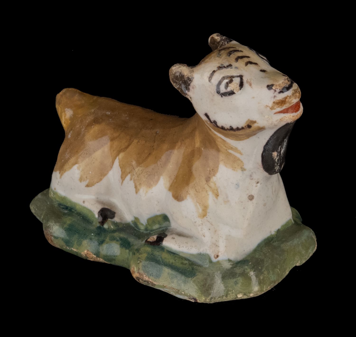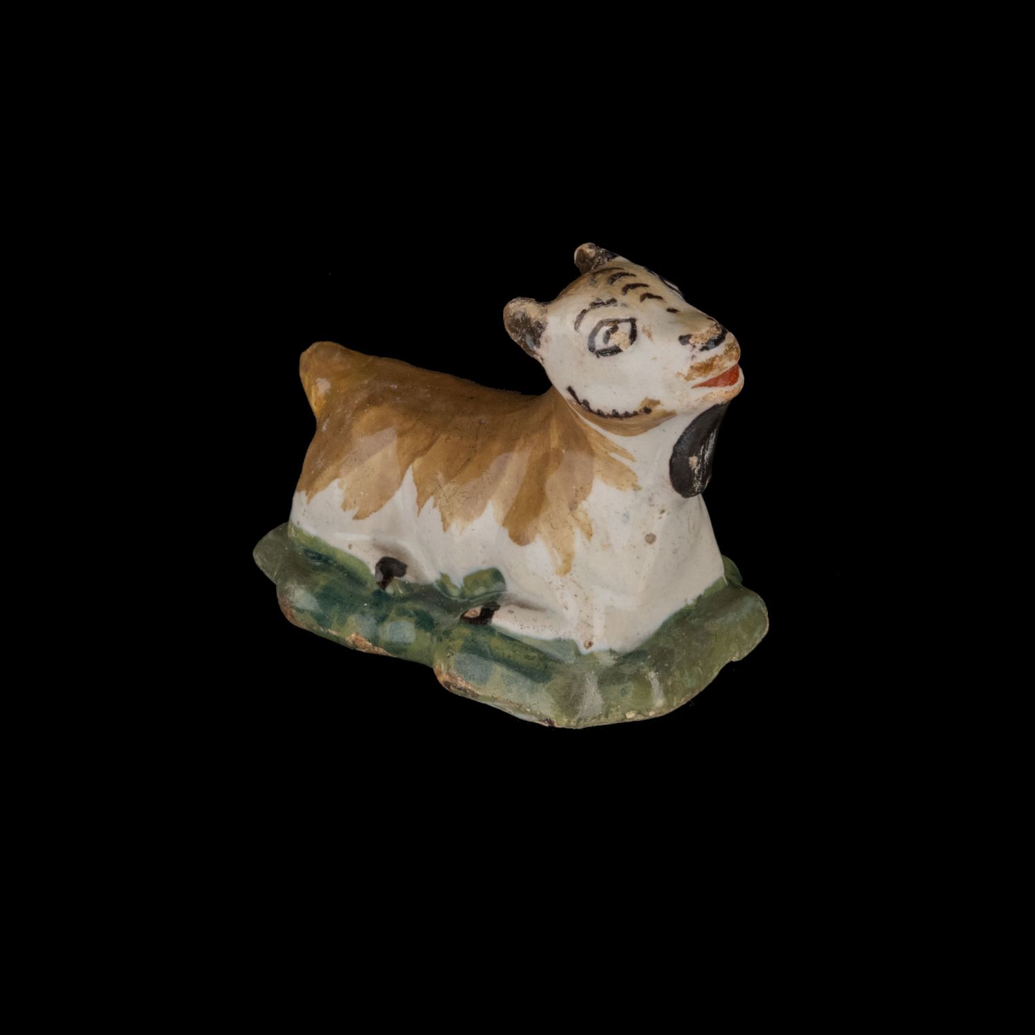 De deels bruin beschilderde, liggende koe heeft haar kop opgeheven en ligt op een groen voetstuk.