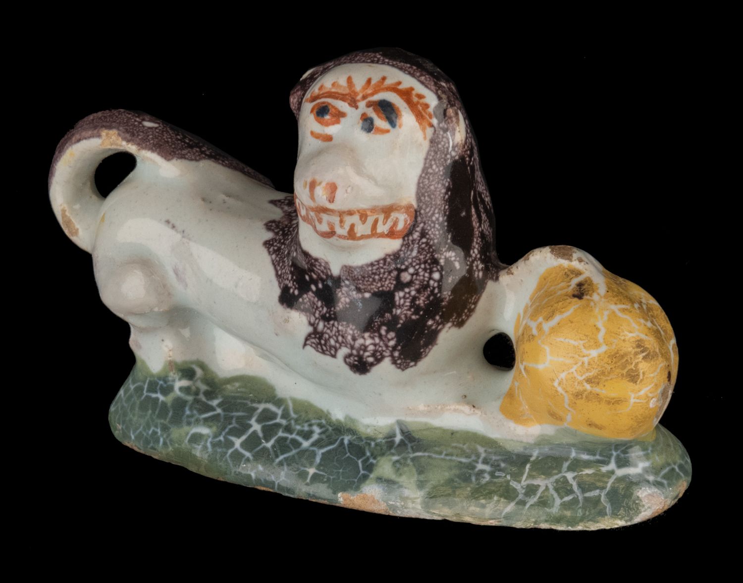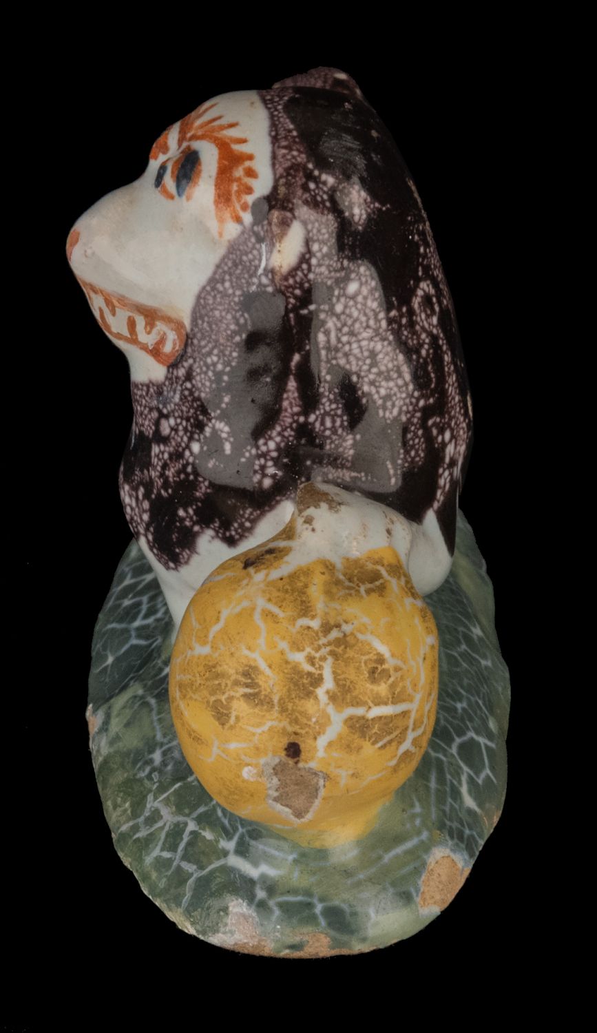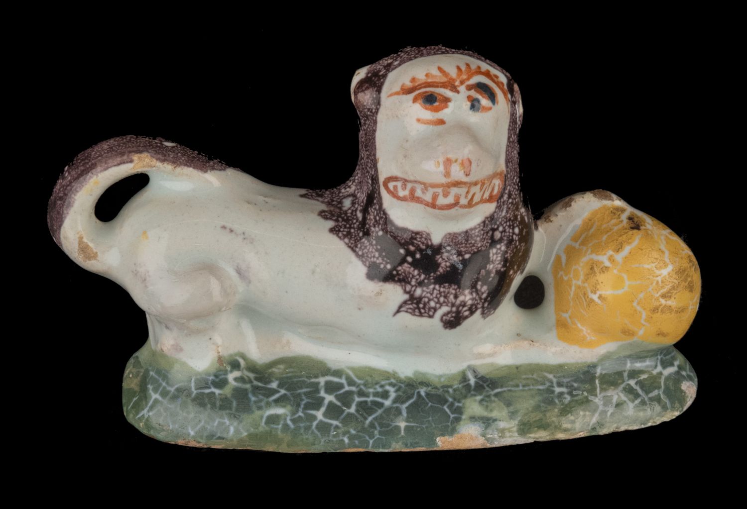 The lion stands on a green base, with its left paw resting on a yellow ball. Its watchful gaze is turned to the right, its posture tense, ready for action. The mane and raised tail are rendered in dark purple. The eyebrows, nose and mouth are depicted in orange-brown, while the eyes combine orange-brown with accents of deep purple.