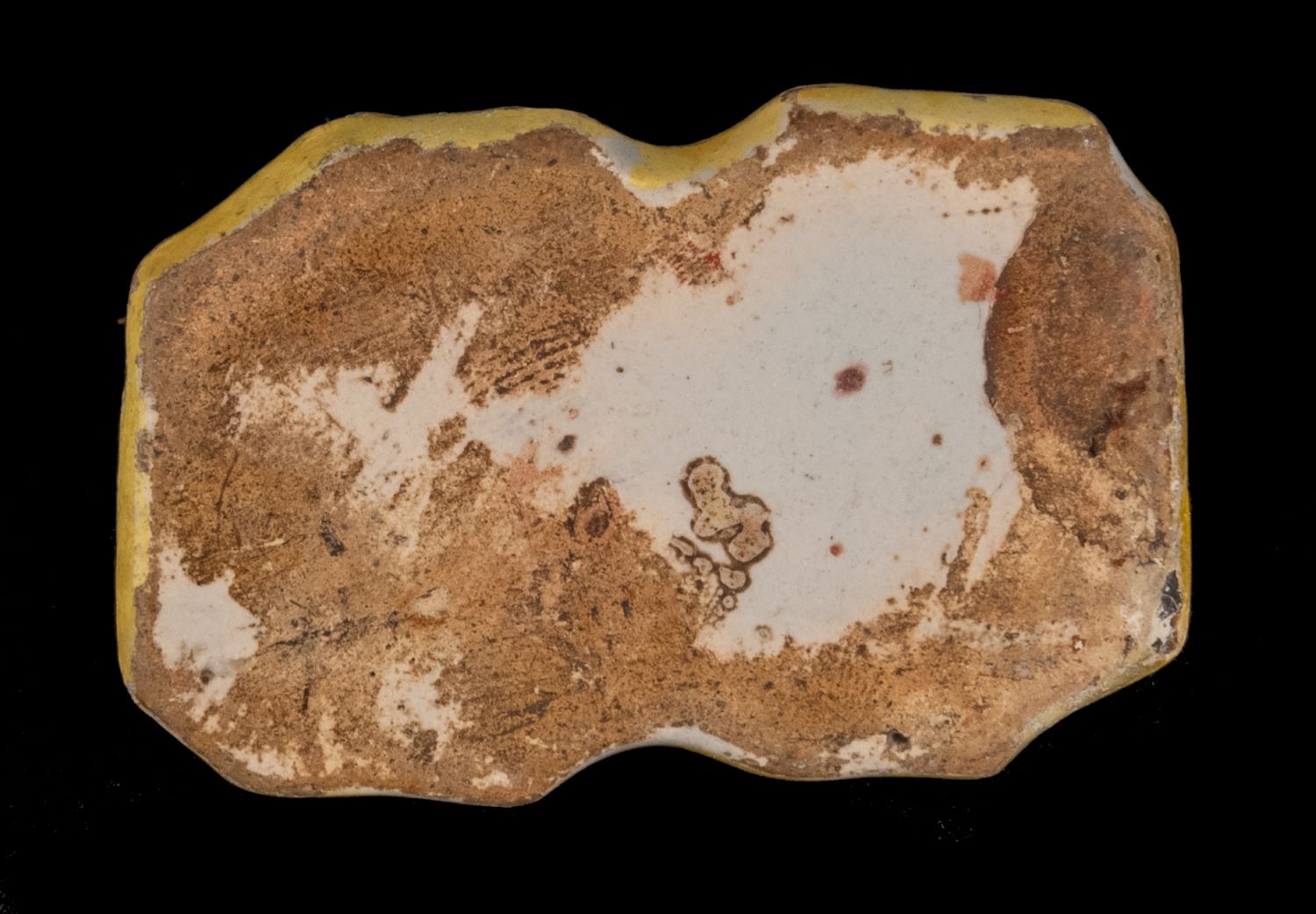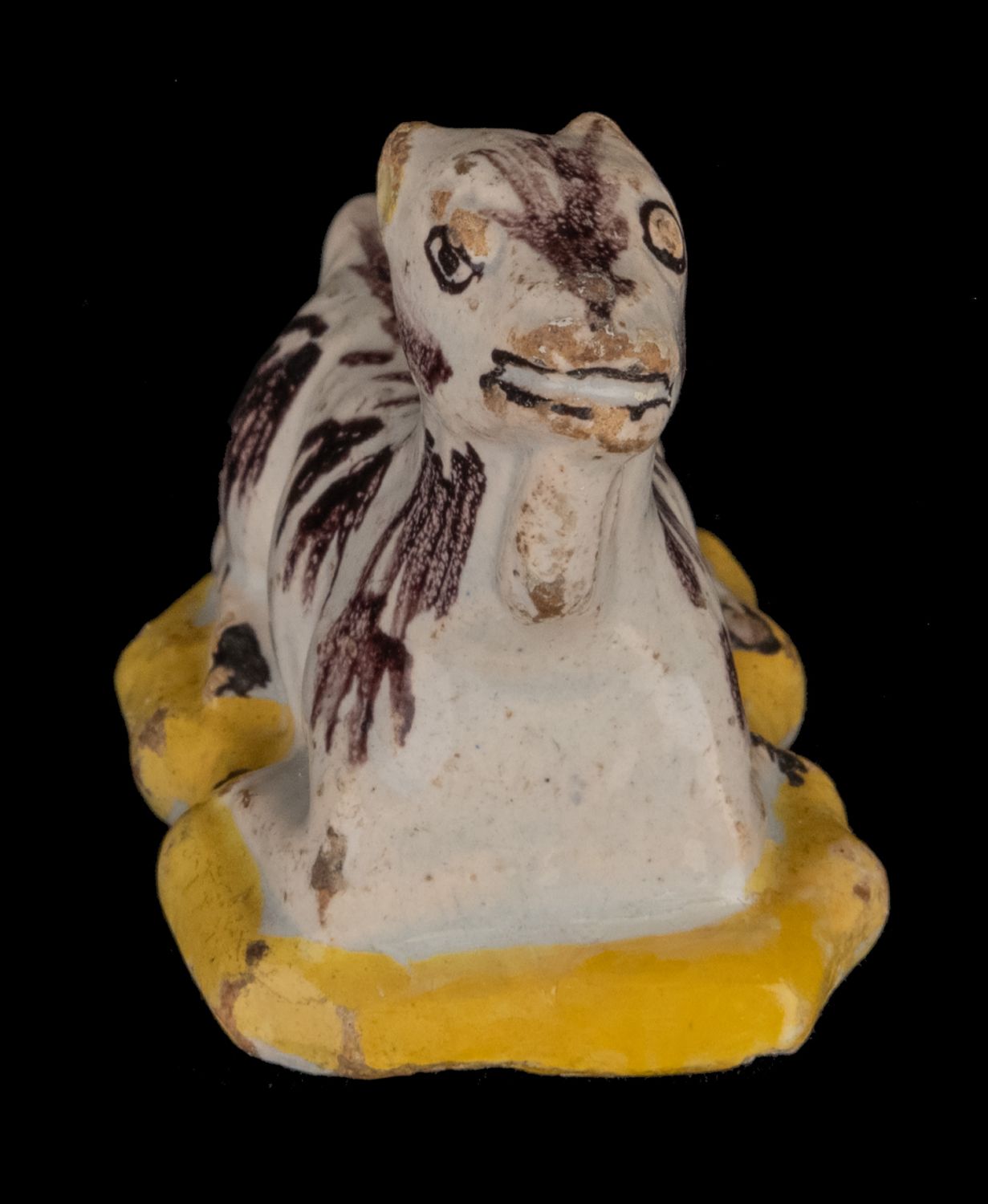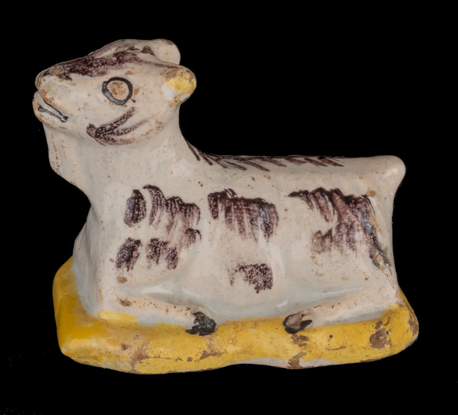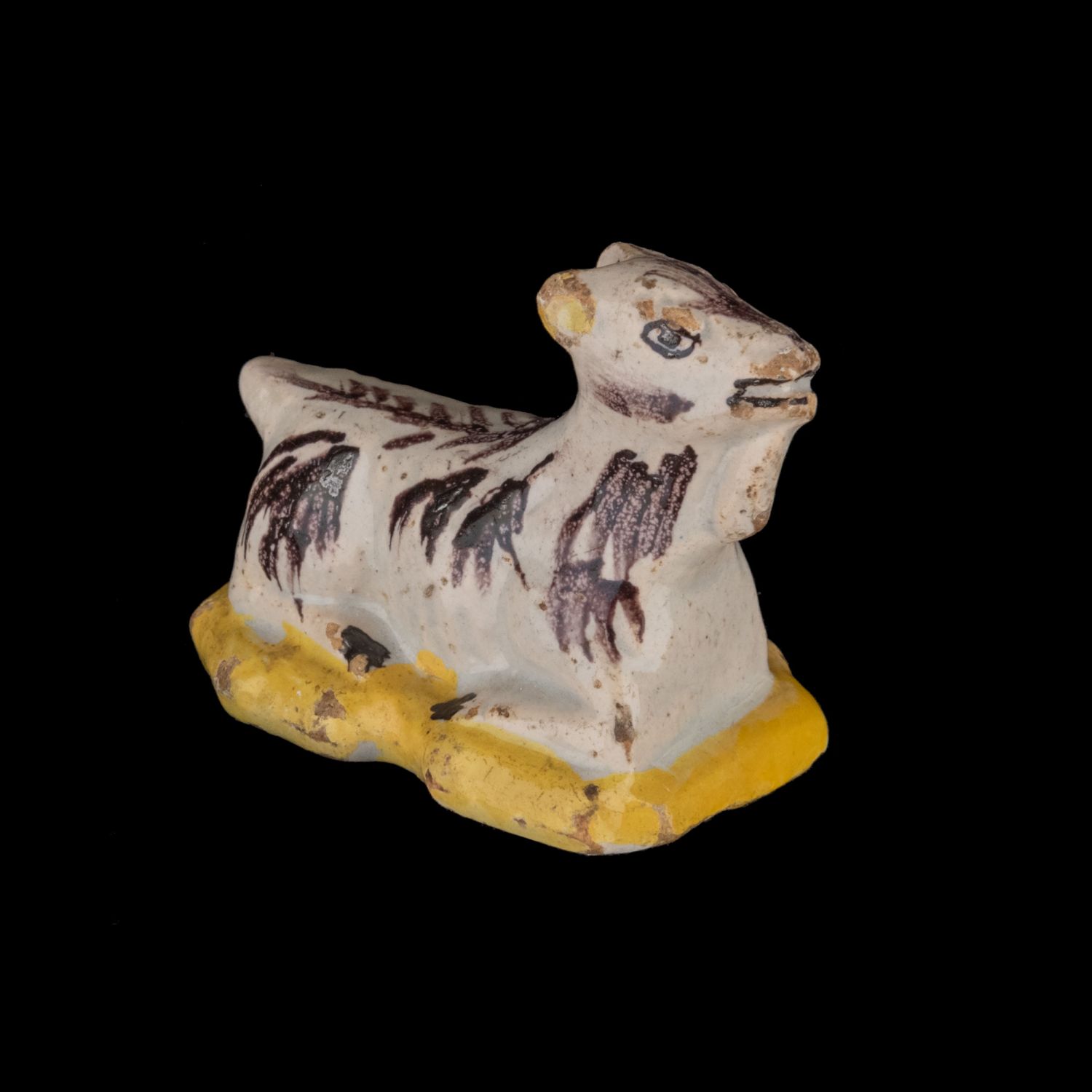 The reclining goat lies on a yellow base and has raised its head. Its face and coat are accented in purple, and the inside of its ears are coloured yellow.