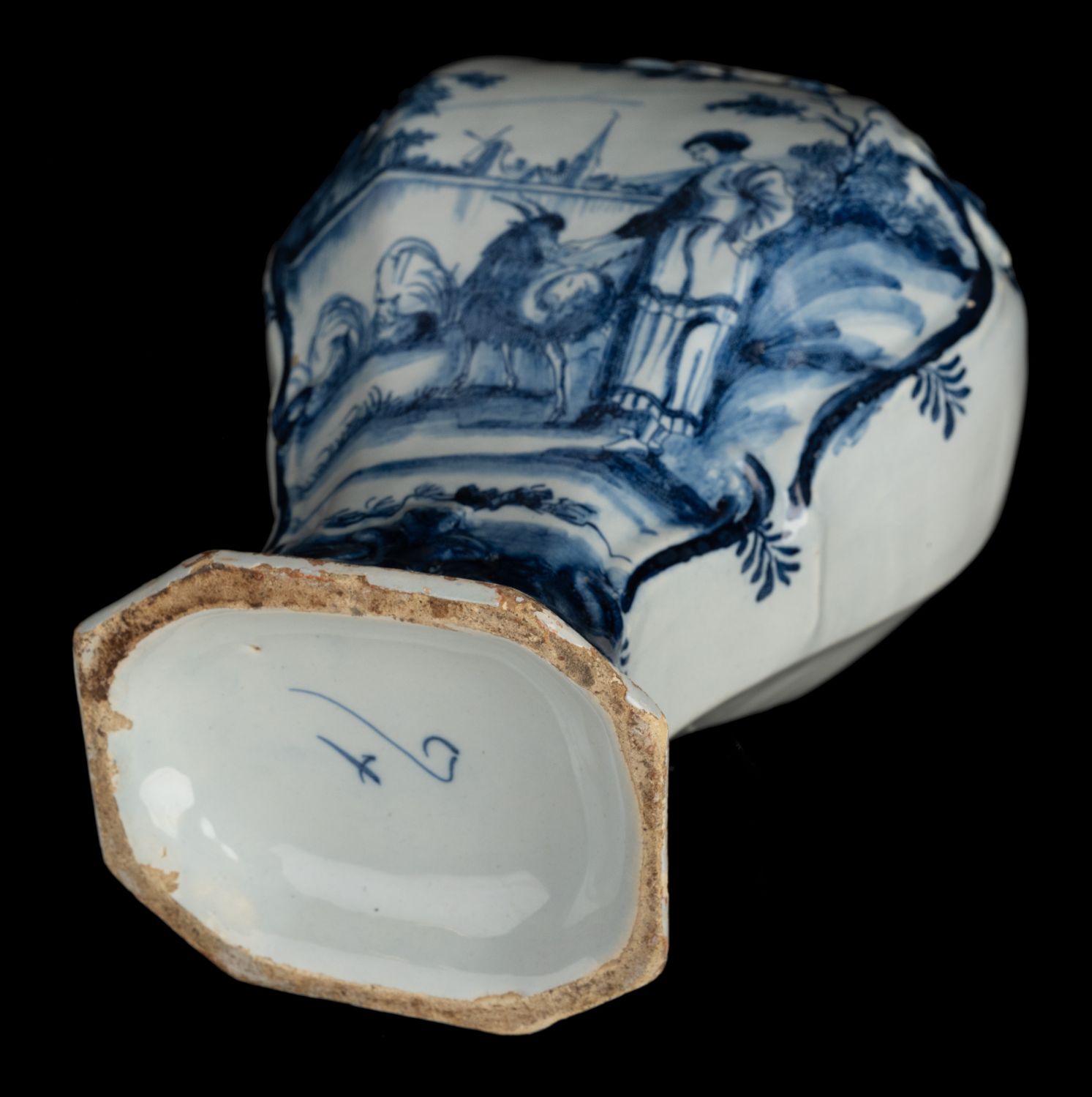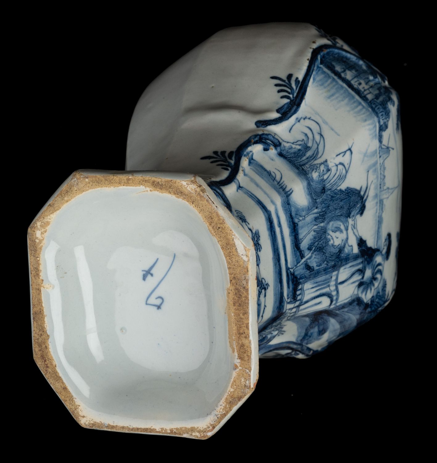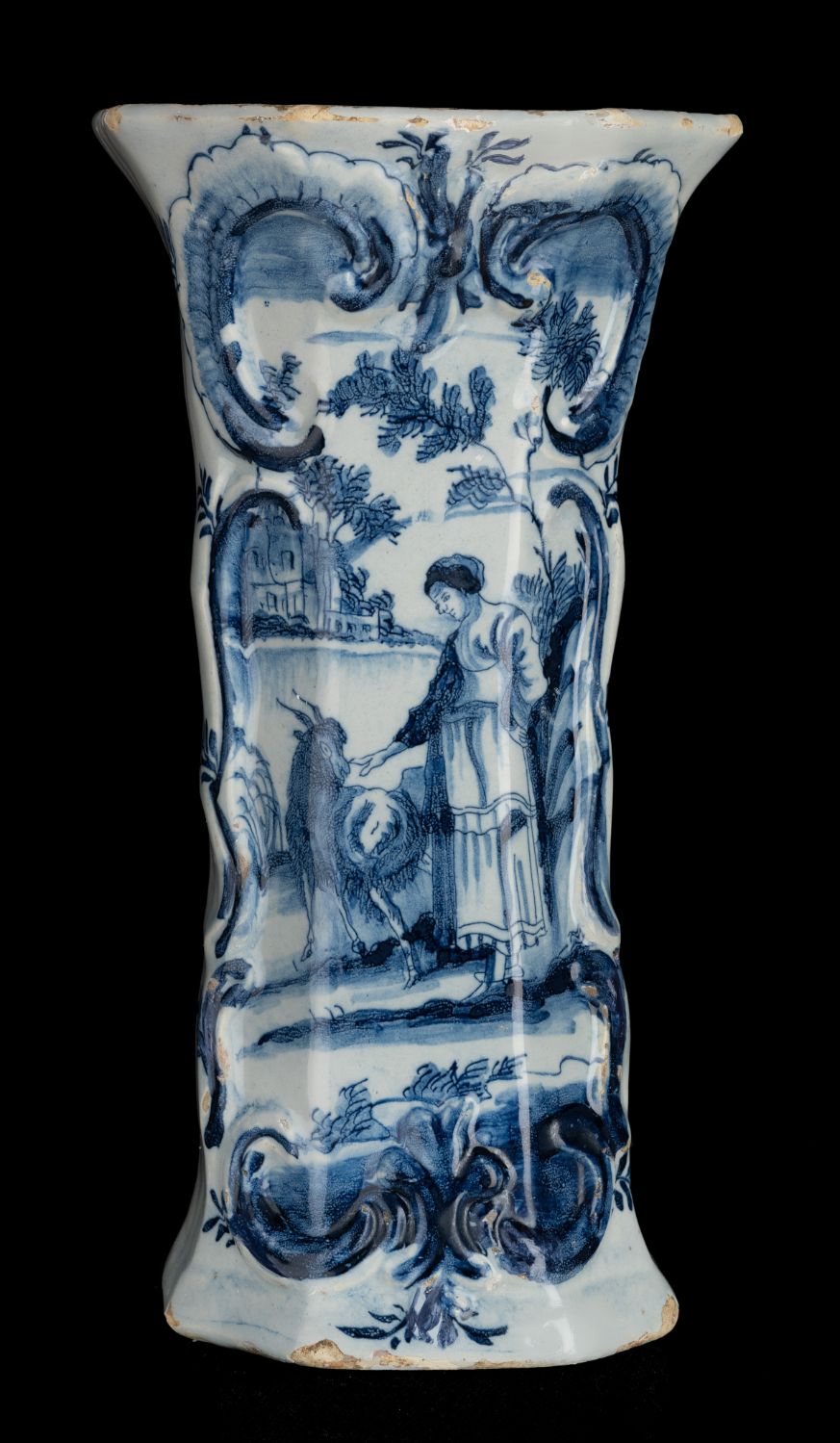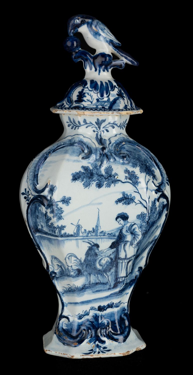 Het achtkantige kaststel bestaat uit drie balustervormige vazen met deksel en twee bekervazen. Het gewelfde deksel heeft een knop in de vorm van een bes-etende papegaai op een stronk. Het kaststel is in blauw beschilderd met een vrouw en een bok in een waterlandschap. Het decor is gevat in een cartouche van in reliëf gemodelleerde C- en S-voluten. Op de voorzijde van de korte hals is een bloemtak aangebracht. De achterzijde van de vazen is beschilderd met een bladertak.