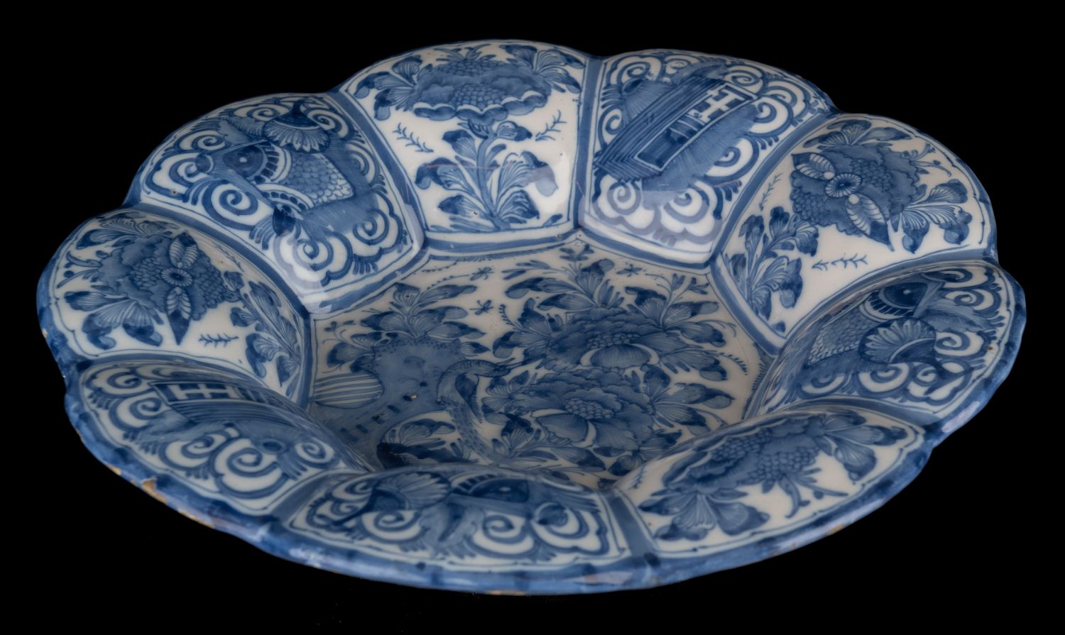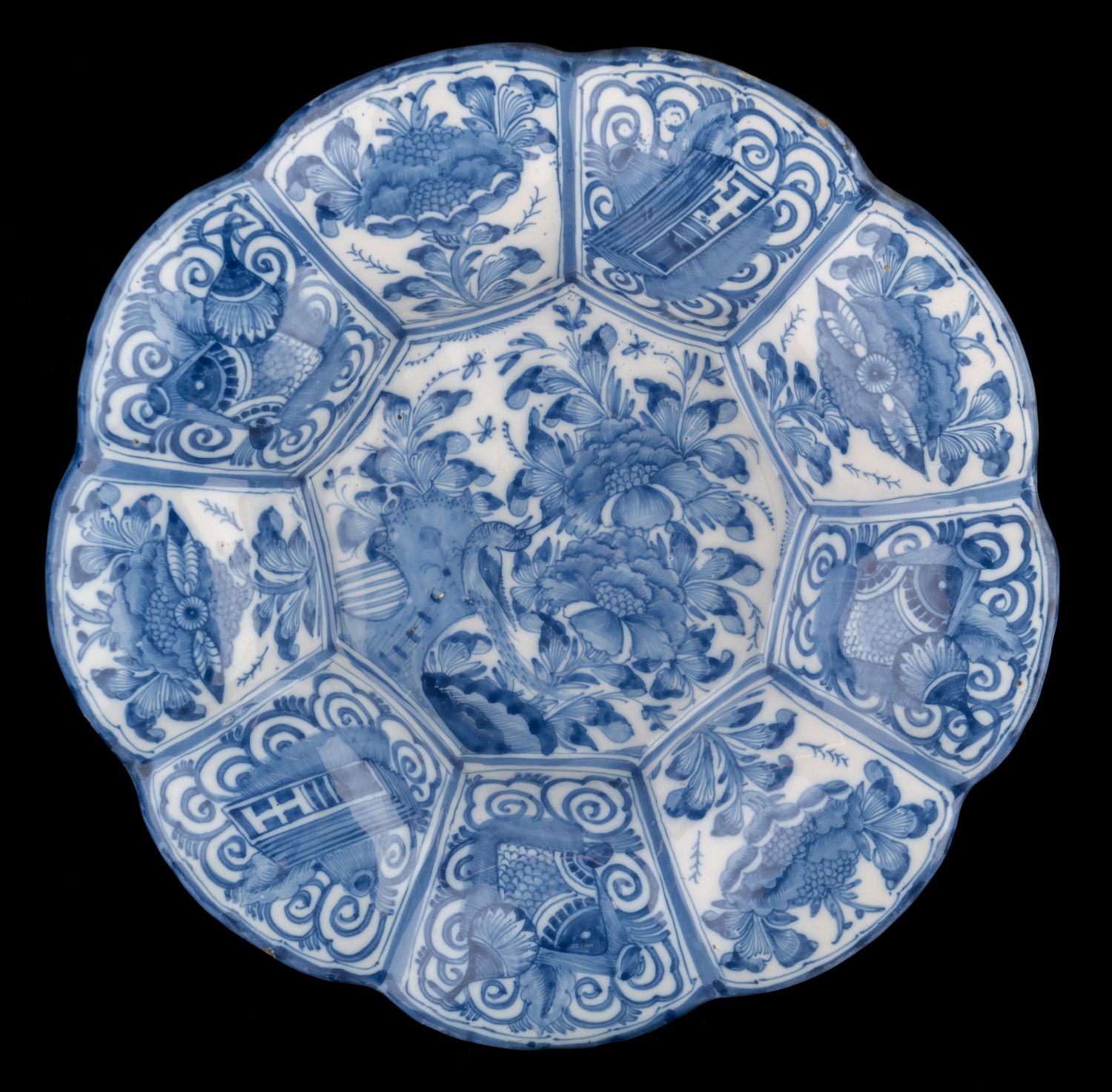 This decor is derived from Chinese kraakporcelain from the first half of the seventeenth century. It was used in many variations on Dutch dishes from Delft and other places, but is rare on lobed dishes. The design and more naturalistic rendering of the flower branches on this lobed dish are otherwise rare on lobed dishes.