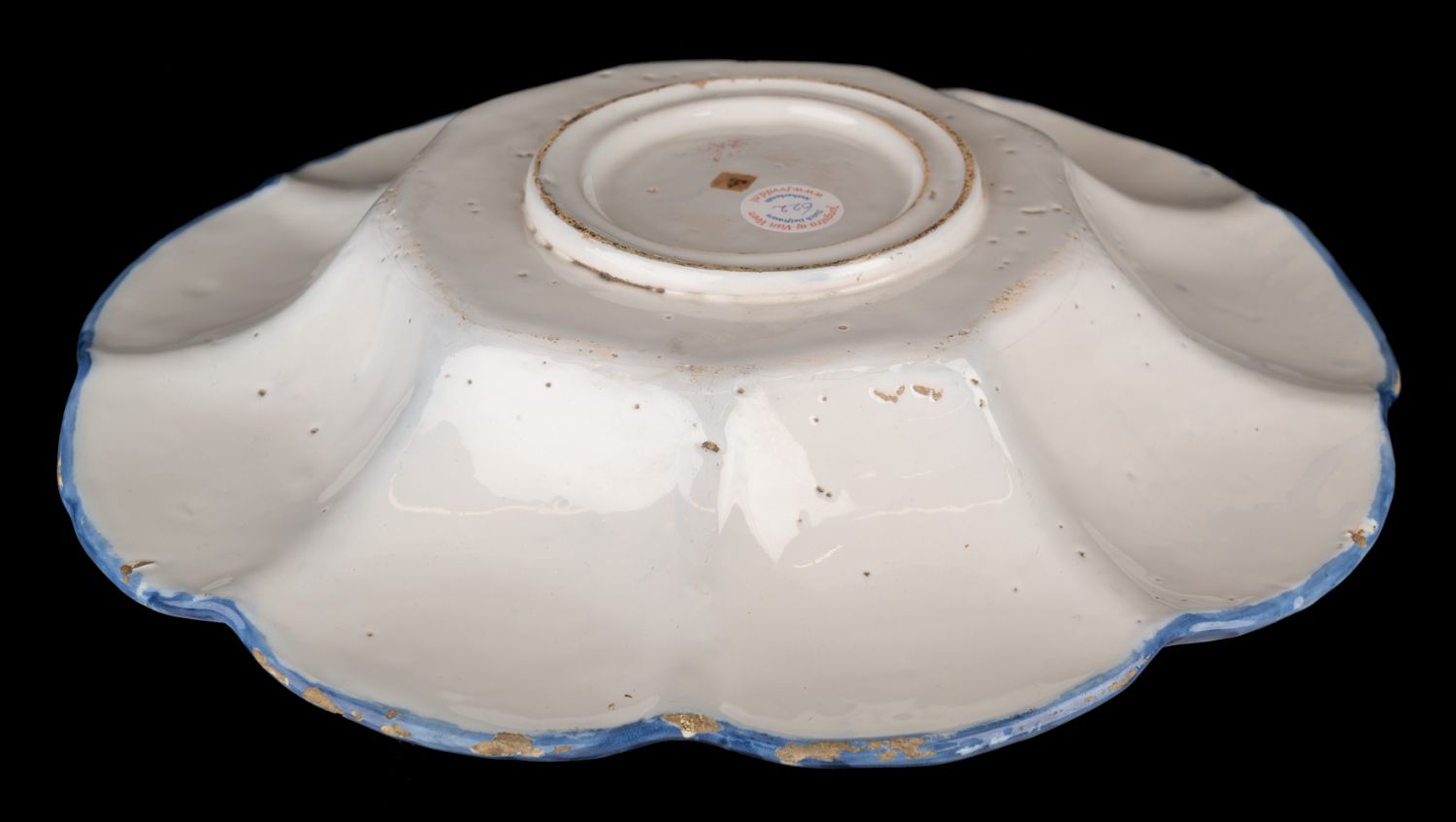 The lobed dish has nine single, wide lobes and is painted in blue with a floral chinoiserie decor of a peacock on a rock among flowers and plants. Several butterflies fly in the air. The nine lobes are decorated with panels in which four different decors are painted: two different floral decors and two variations of oriental objects on a ground of scrolls. The rim is blue.