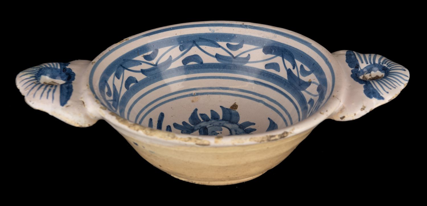 Porringers were made both in faience and in maiolica, like this example, and were manufactured by many potteries mainly in the seventeenth century.