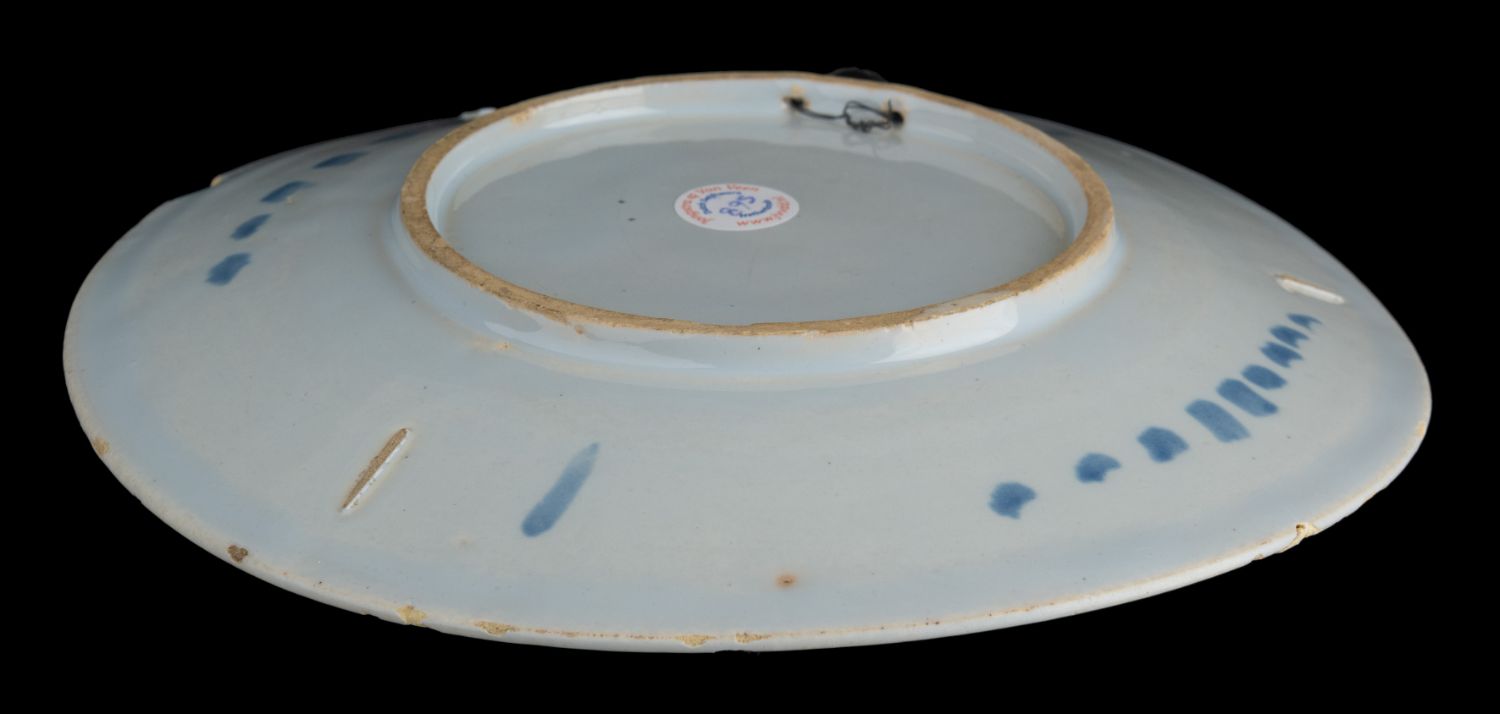 Het blauw-witte bord heeft een brede, vlakke en enigszins opstaande rand en is in het plat beschilderd met een chinoiseriedecor van twee zittende en converserende Chinezen in een landschap. De Chinees links houdt in zijn rechterhand een bloem of vrucht omhoog, de rechter heeft een grote schaal met vers geplukte vruchten op zijn schoot. De vertreding is onbeschilderd. De rand is gedecoreerd met bloemen en bladranken op een grond van krulornament.