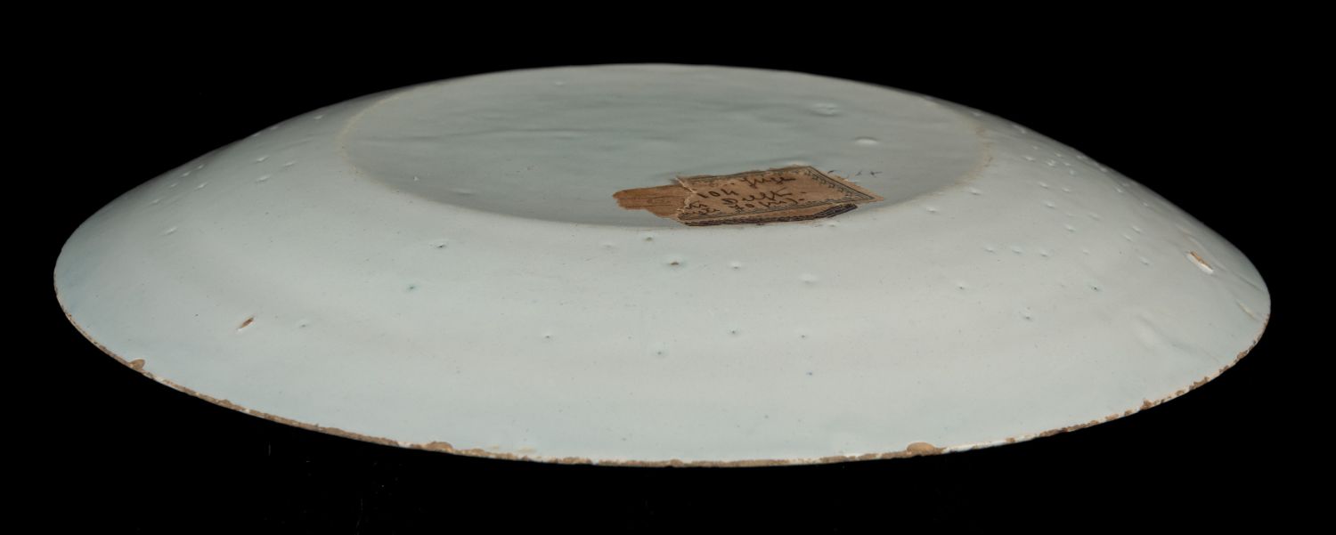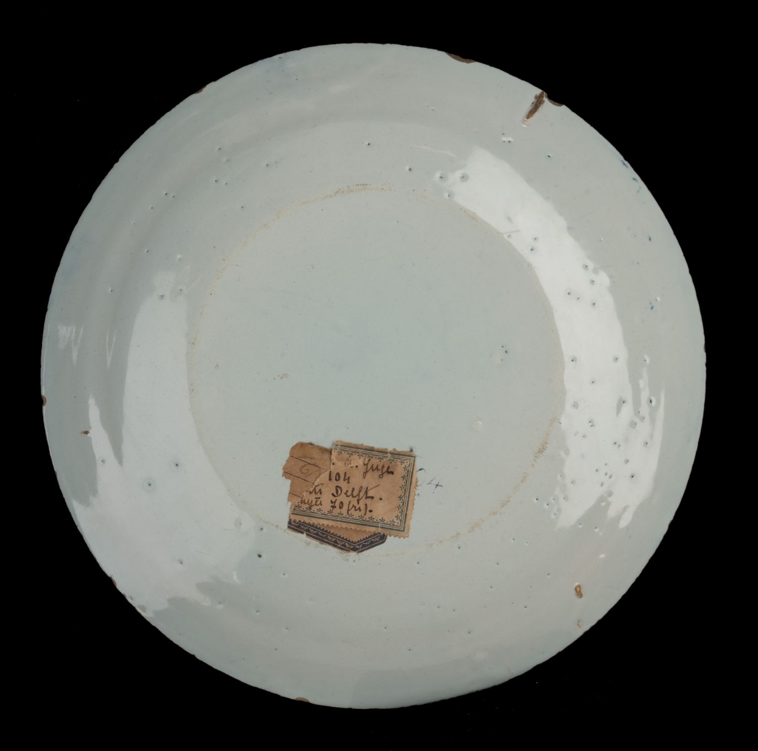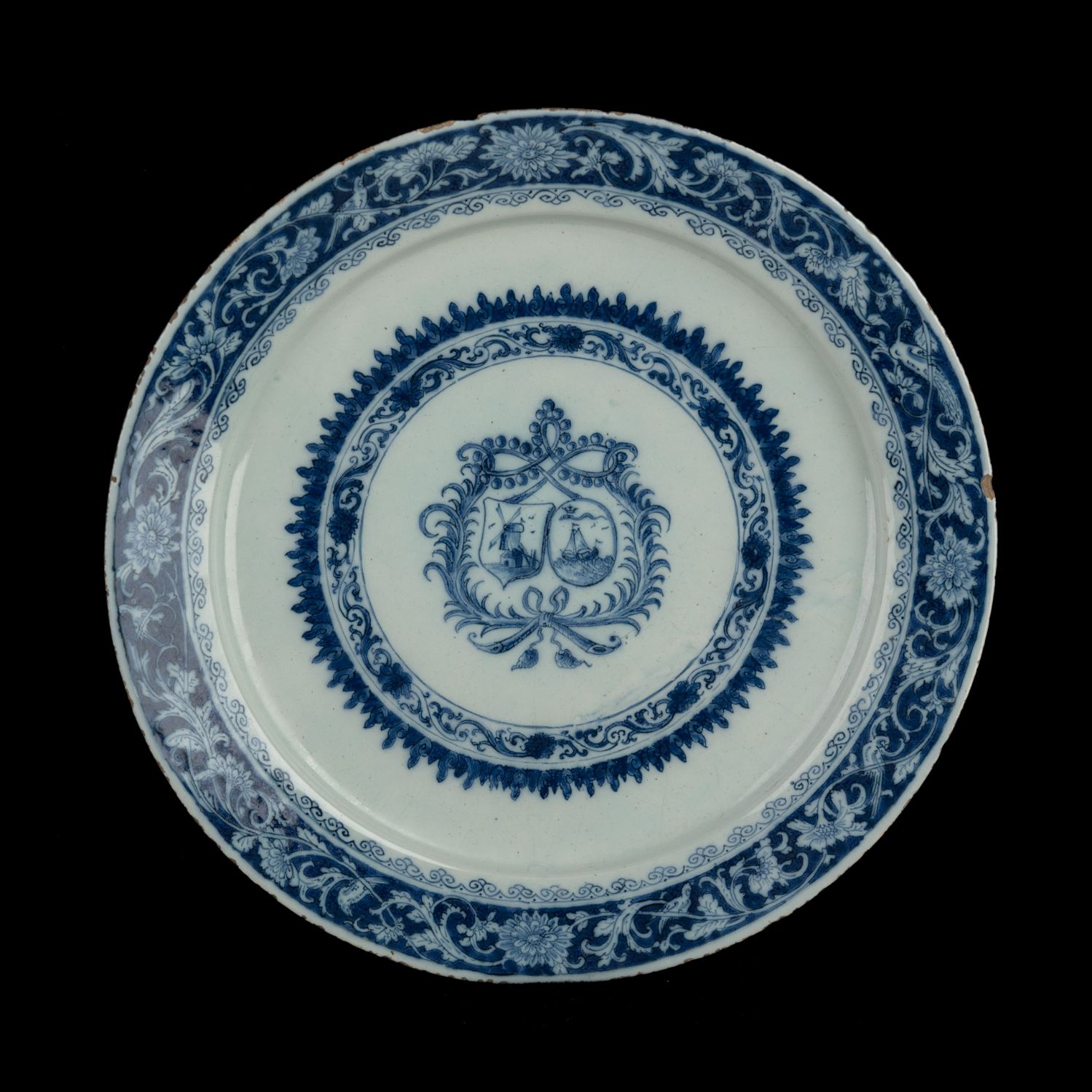 Het bord heeft een licht opstaande vlakke rand en is in blauw beschilderd met een heraldisch alliantiewapen, vermoedelijk voor een huwelijk. De wapenschilden zijn gevat tussen twee aan elkaar gebonden lauriertakken en hangen aan een gevlochten lint met balletjes. Het geheel is omvat door een cirkelvormige band met een rondlopende bloem- en bladrank, met overhoeks geplaatste punten afgewisseld met krulornamenten. In het linker - gepunte - wapenschild is een molen aangebracht, het rechter wapenschild is ovaal en bevat een schip op zee onder een kroon en banier. Een brede band op het plat is onbeschilderd gelaten, de vertreding is voorzien van een band met kleine, aaneen geschakelde ornamentjes. Op de rand is op een blauw fond een rondlopende bloem- en bladrank met zes vogels, waaronder een pauw, uitgespaard.