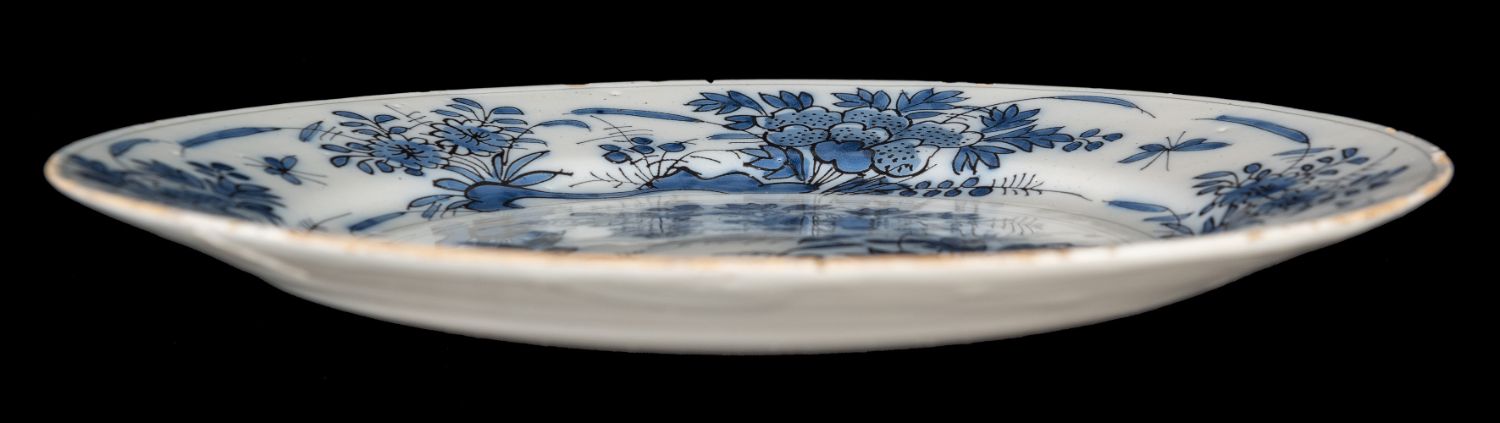 Het blauw-witte bord heeft een vlakke rand en is beschilderd met een chinoiserie decor van een rotslandschap met verschillende bloemen en planten. Een vogel vliegt in de lucht. Het decor is gevat in een dubbele cirkel. Op de vertreding en rand zijn drie brede rotslandschappen geschilderd, van elkaar gescheiden door een insect.