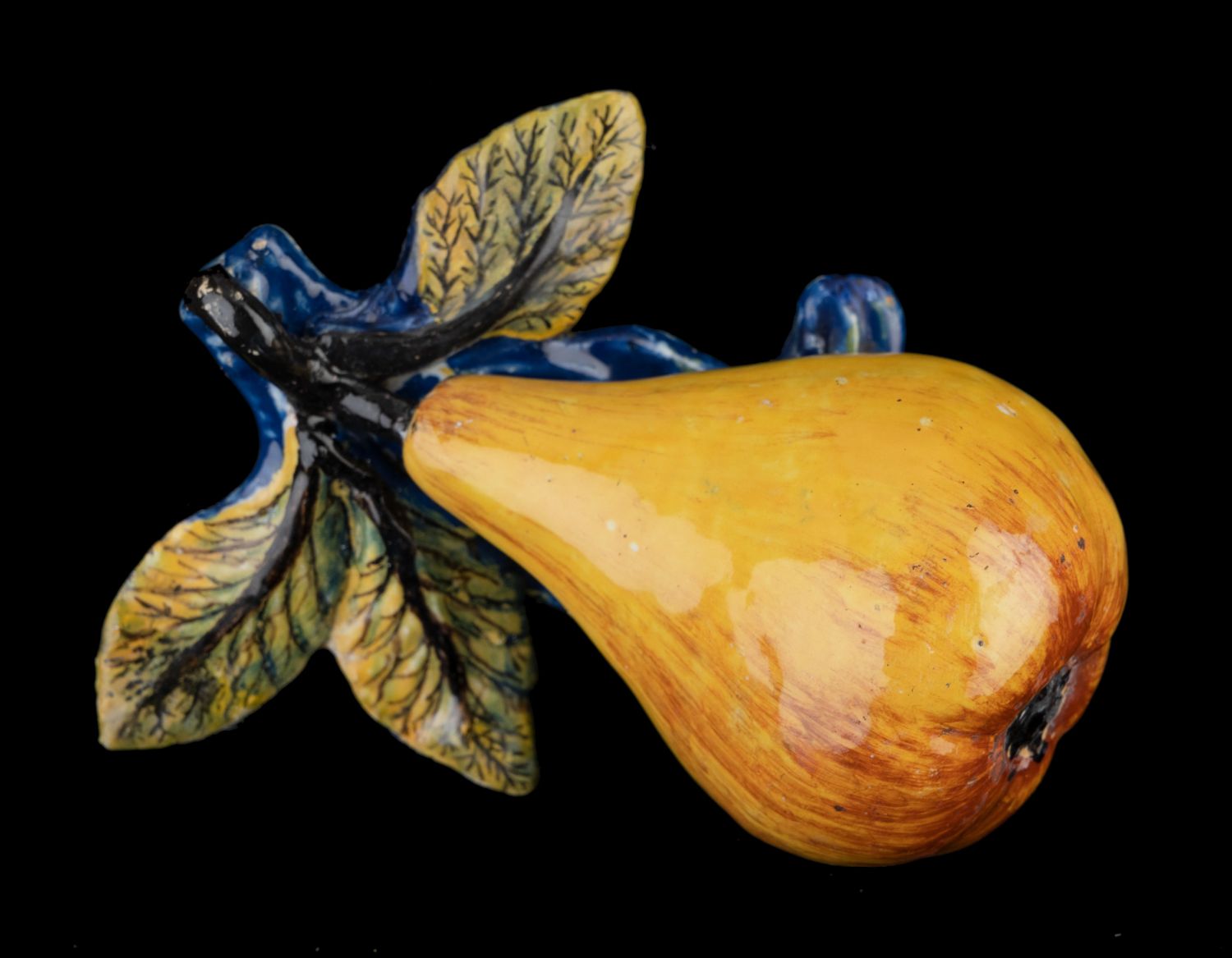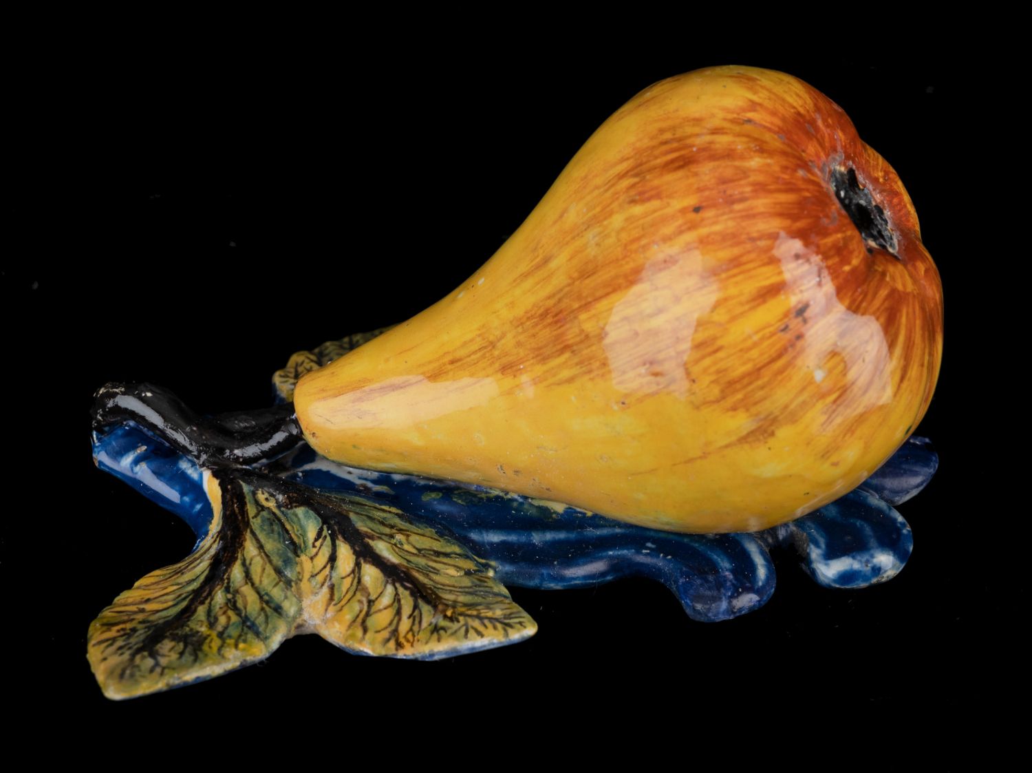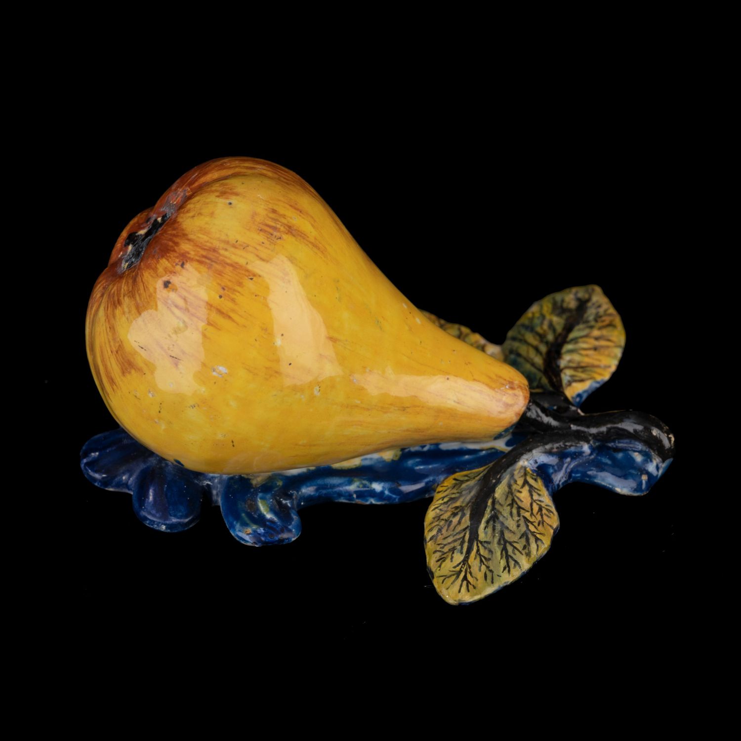Plastieken van fruit zijn in Delft in de tweede helft van de achttiende eeuw op grote schaal vervaardigd. Ze vinden hun oorsprong in de rococo-periode (1730-1770) toen terrines en andere tafelstukken in faience in realistische dier-, groente- en fruitvormen werden uitgevoerd. Van de plastieken wordt aangenomen dat ze als losse ornamenten op de rijk gedekte tafel werden opgesteld. Wellicht werd een deel ook ter decoratie in een keuken opgehangen. Behalve peren zijn ook appels, druiven, pruimen en kastanjes bekend in Delfts aardewerk.