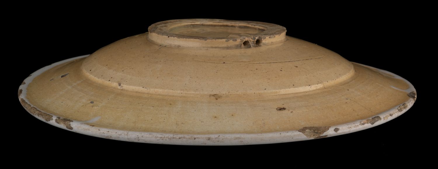 De blauw-witte schotel heeft een brede, spreidende rand en is in het plat beschilderd met een gevleugelde triton met zwaard en schild. Het wezen zit op een rots in het water. Op de achtergrond varen schepen aan de horizon. Op de rand is een vijfpuntig element aangebracht op een grond van krulornamenten. In het plat zijn drie, voor majolica kenmerkende, proensporen zichtbaar.