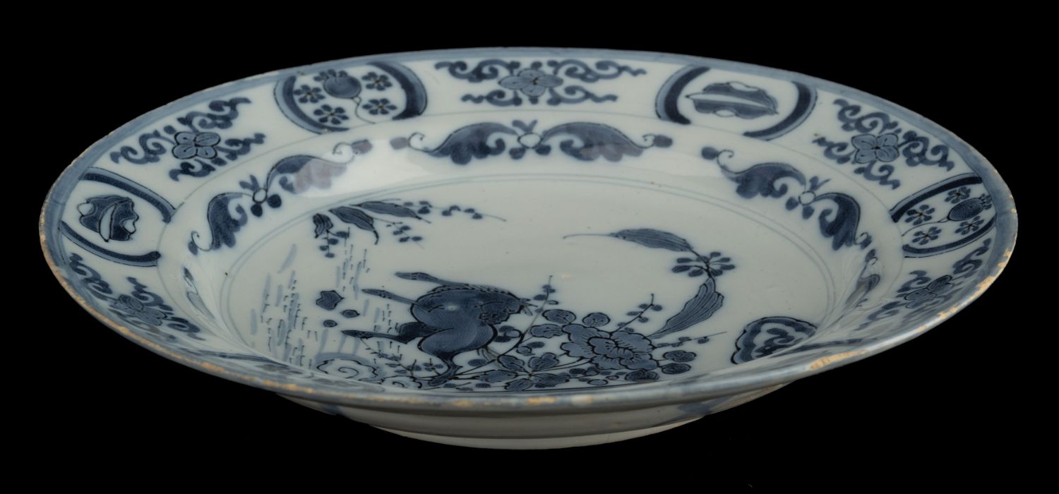 Het blauw-witte bord heeft een vlakke rand en is beschilderd met een chinoiseriedecor. In een oosters tuinlandschap springt een achteromkijkend paard tevoorschijn uit struikgewas naast een schutting of paneel. Op de vertreding zijn zes dubbele bladmotieven aangebracht. Op de rand zijn zes cartouches geschilderd, afgewisseld met een bloem met krulornamenten. De cartouches zijn om en om gevuld met een blad of vrucht. De buitenrand is in blauw. Aan de achterkant zijn strepen en kruizen aangebracht.