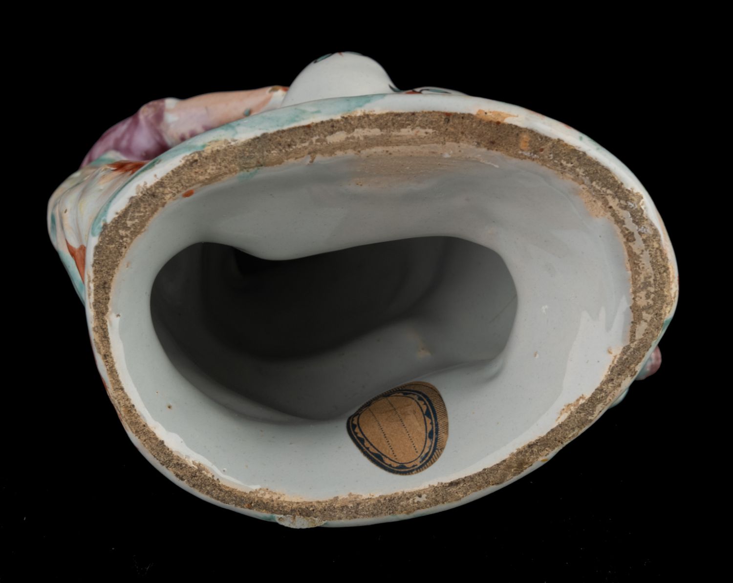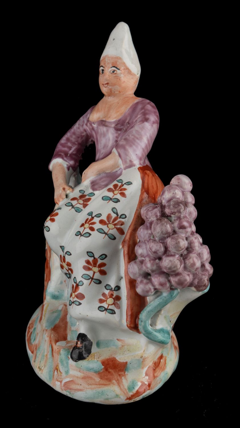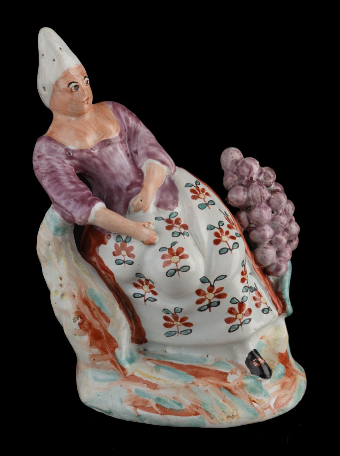 This figurine of autumn is based on a graphic example from the early eighteenth century. The pointed hairstyle, known as a frottage, was fashionable at the time. Presumably, the figurine was made after a print by Petrus Schenk (1660-1713), who published no fewer than six series of the Four Seasons in his lifetime, all building on the same formula: richly dressed full-length figures, mostly women, with seasonal attributes (Bruijnen & Janssen, p. 202). The oblique, half-reclining, pose of the figurine is very similar to that in Schenk's prints.