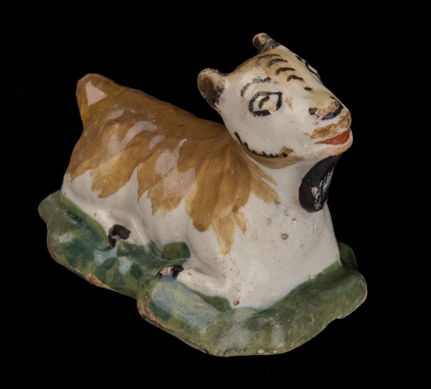 De deels bruin beschilderde, rustende geit heeft haar kop opgeheven en ligt op een groen voetstuk.