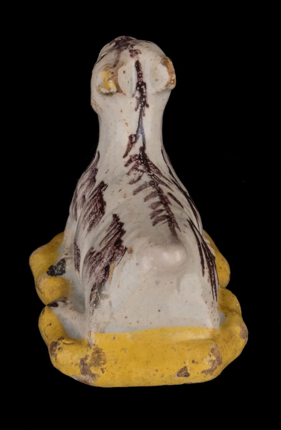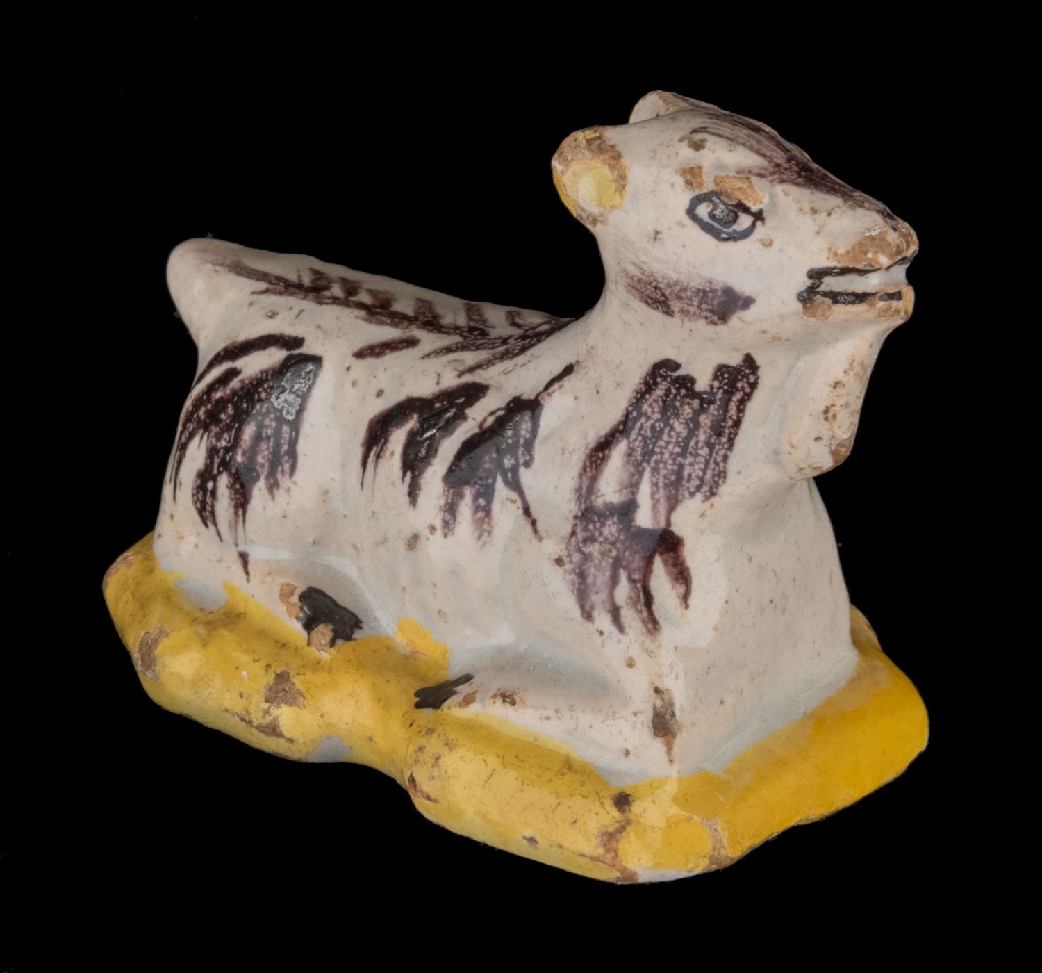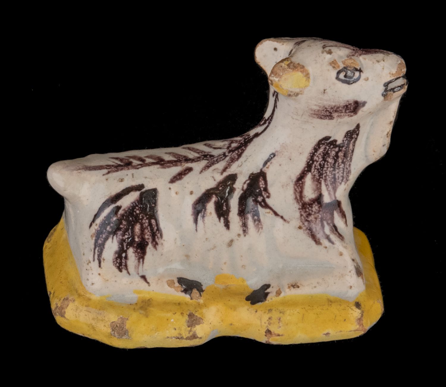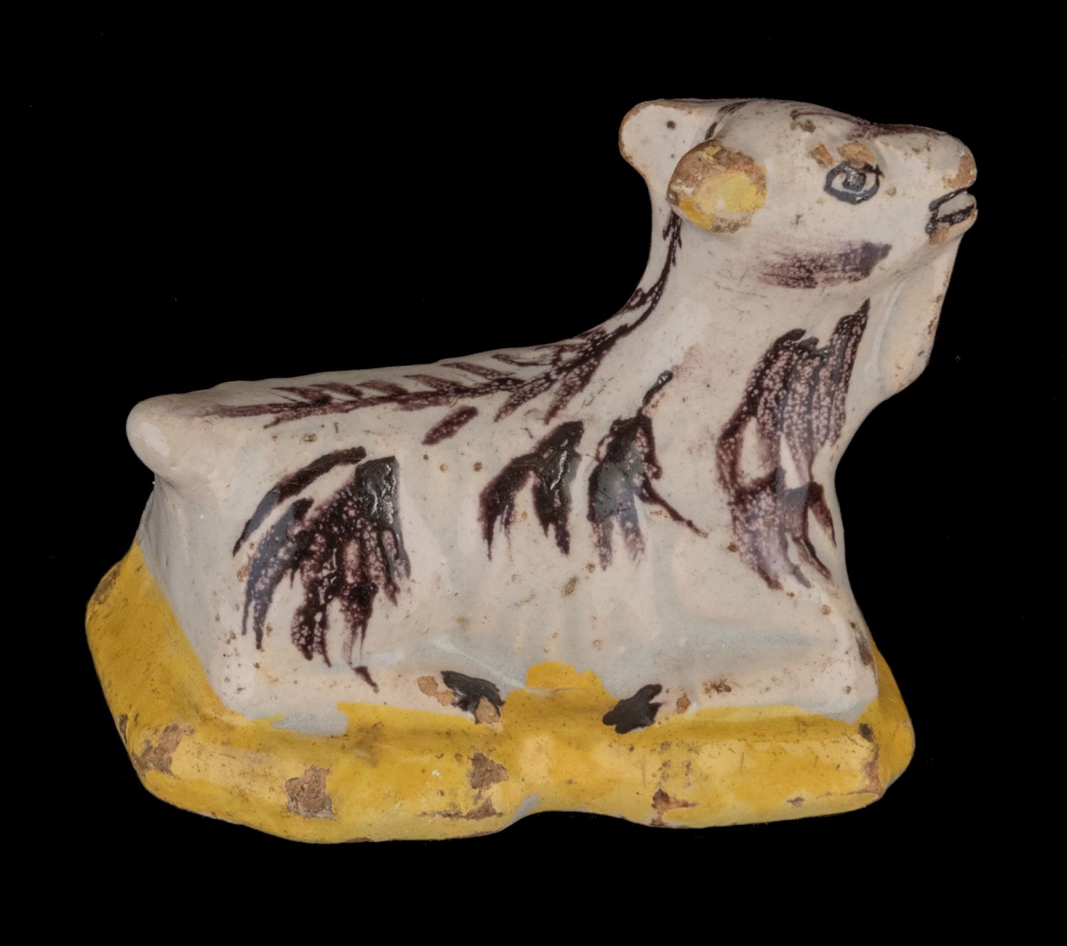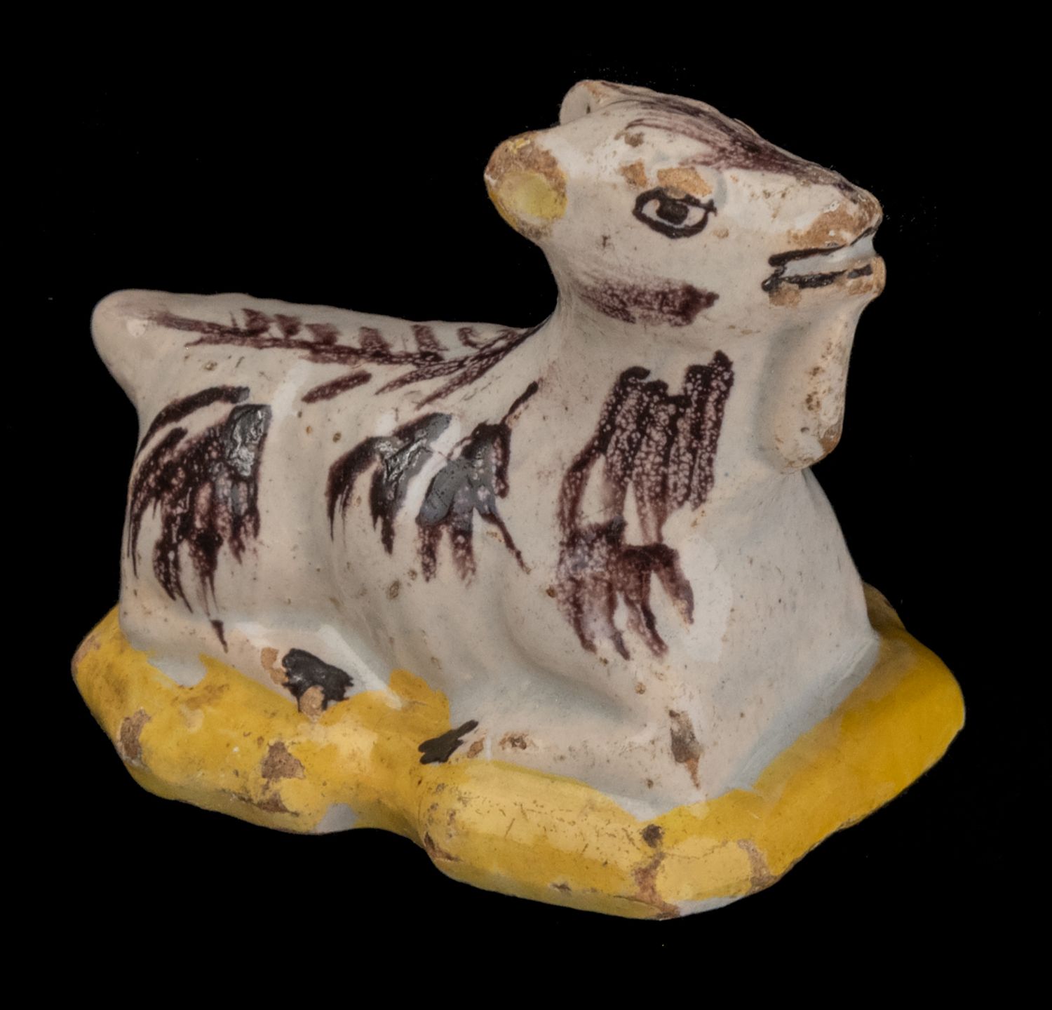 Het rustende geitje ligt op een geel grondje en heeft haar kop geheven. Haar gezicht en vacht zijn in paars geaccentueerd, de binnenzijde van haar oren zijn geel gekleurd.