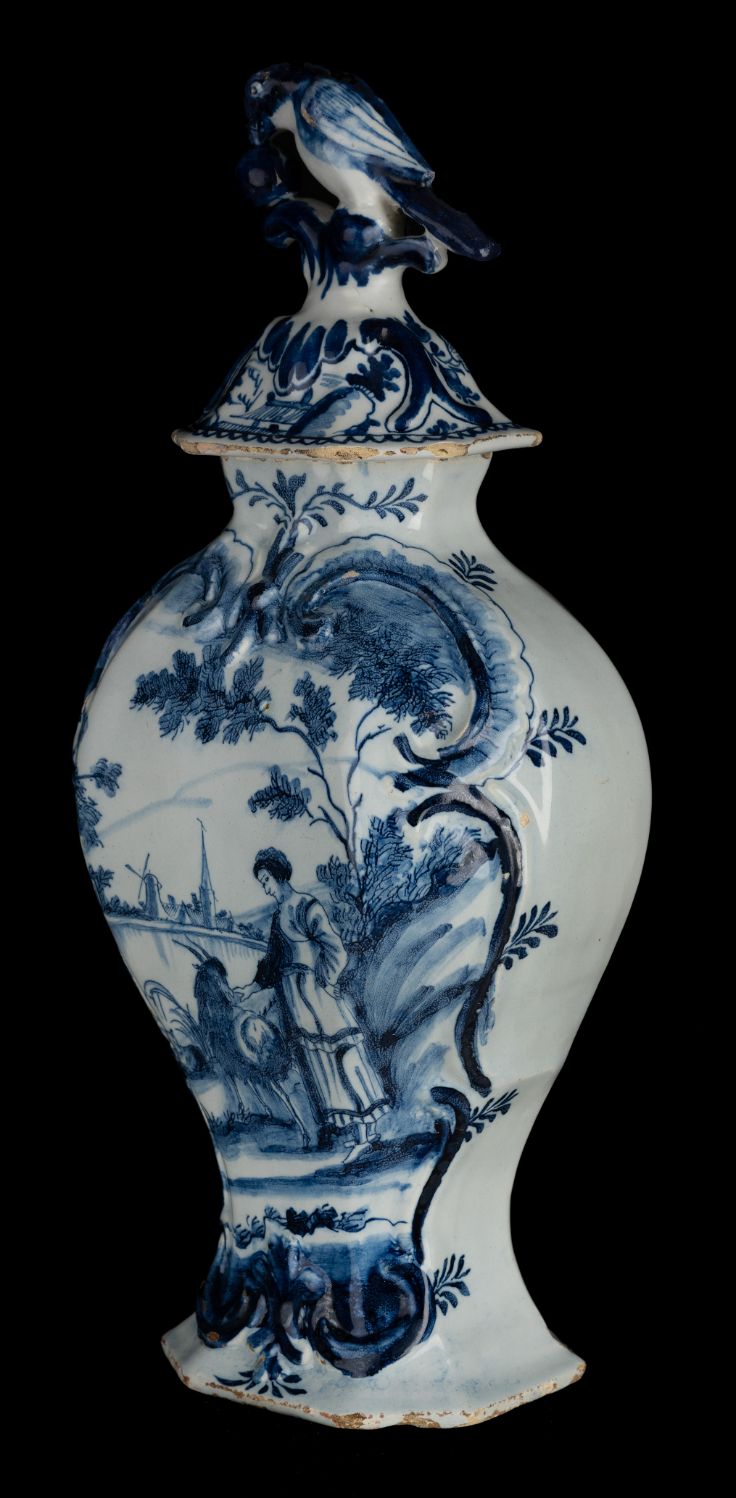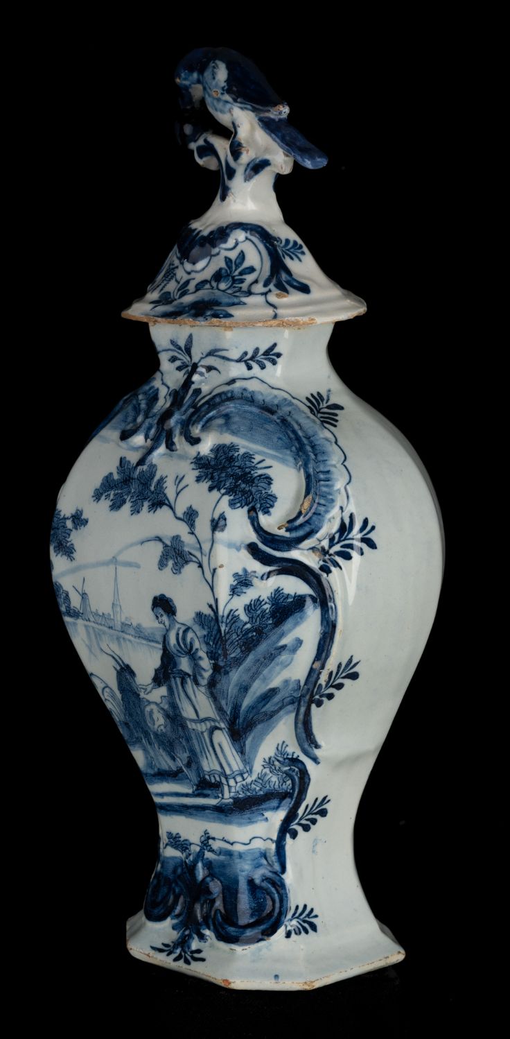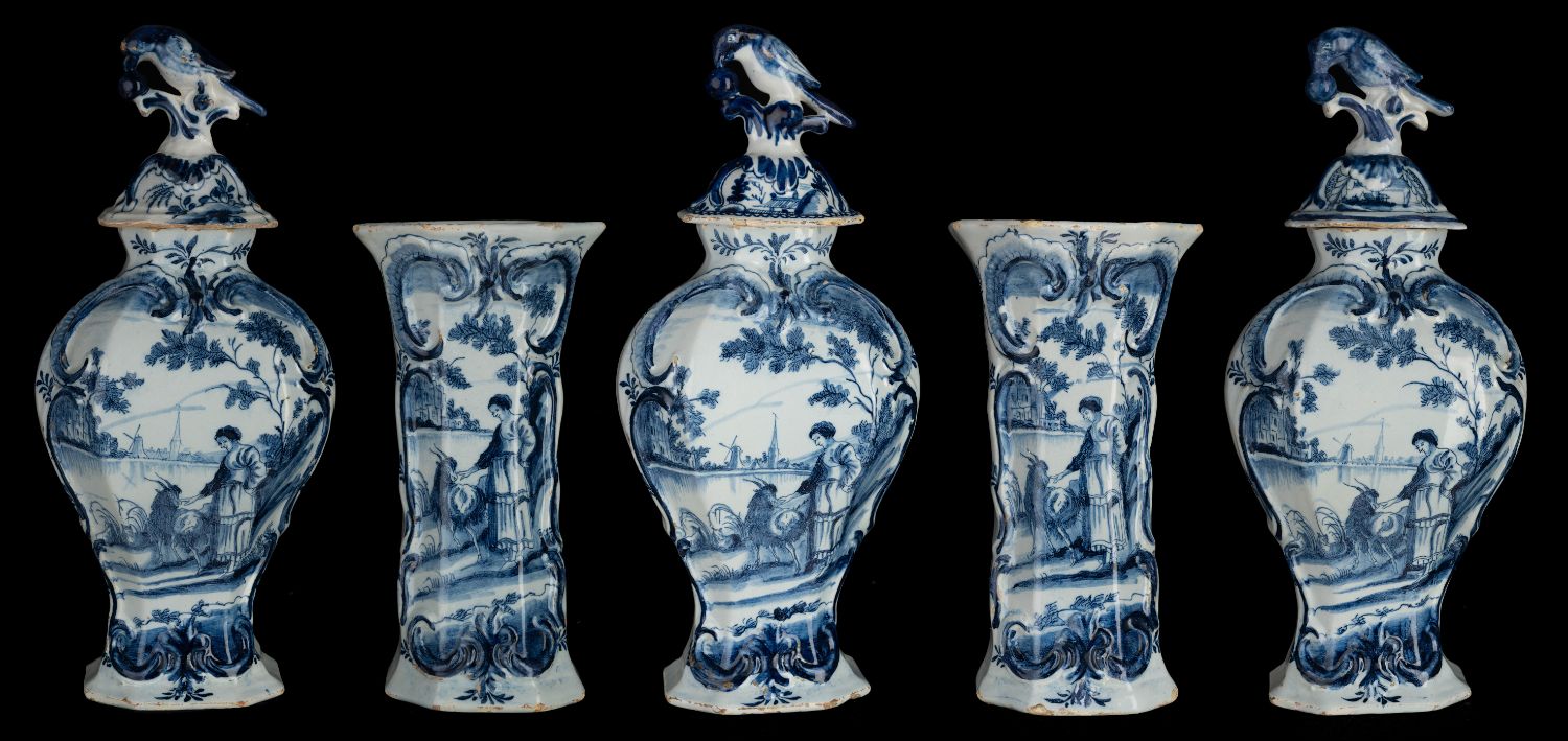 The octagonal garniture consists of three baluster-shaped vases with lids and two beaker vases. The domed lids have a knob in the shape of a berry-eating parrot on a stump. The garniture is painted in blue with a woman and a goat in a water landscape. The decoration is framed by a cartouche of relief-modelled C and S volutes. A flower branch is depicted on the front of the short neck. The back of the vases is painted with a leaf branch.