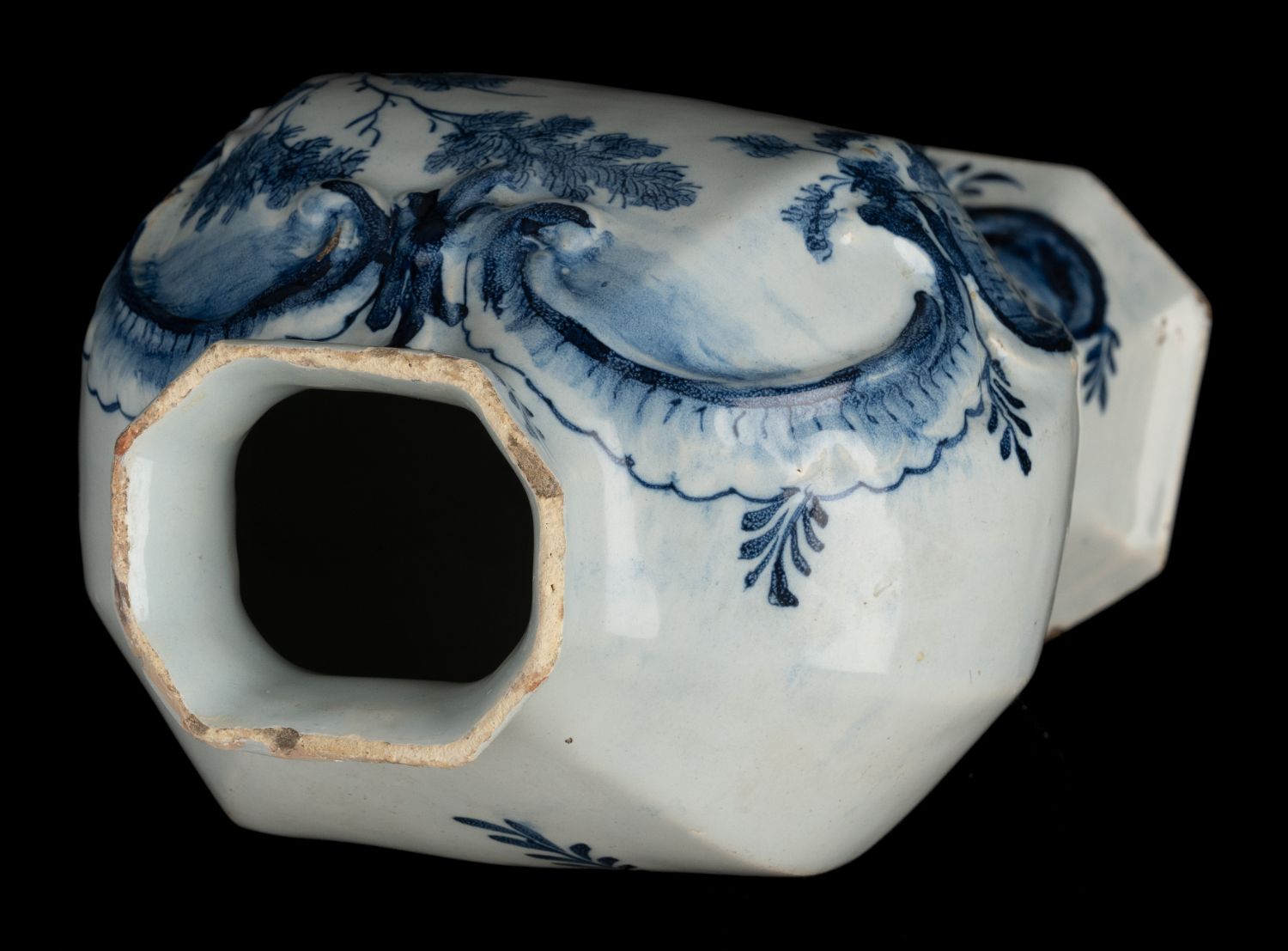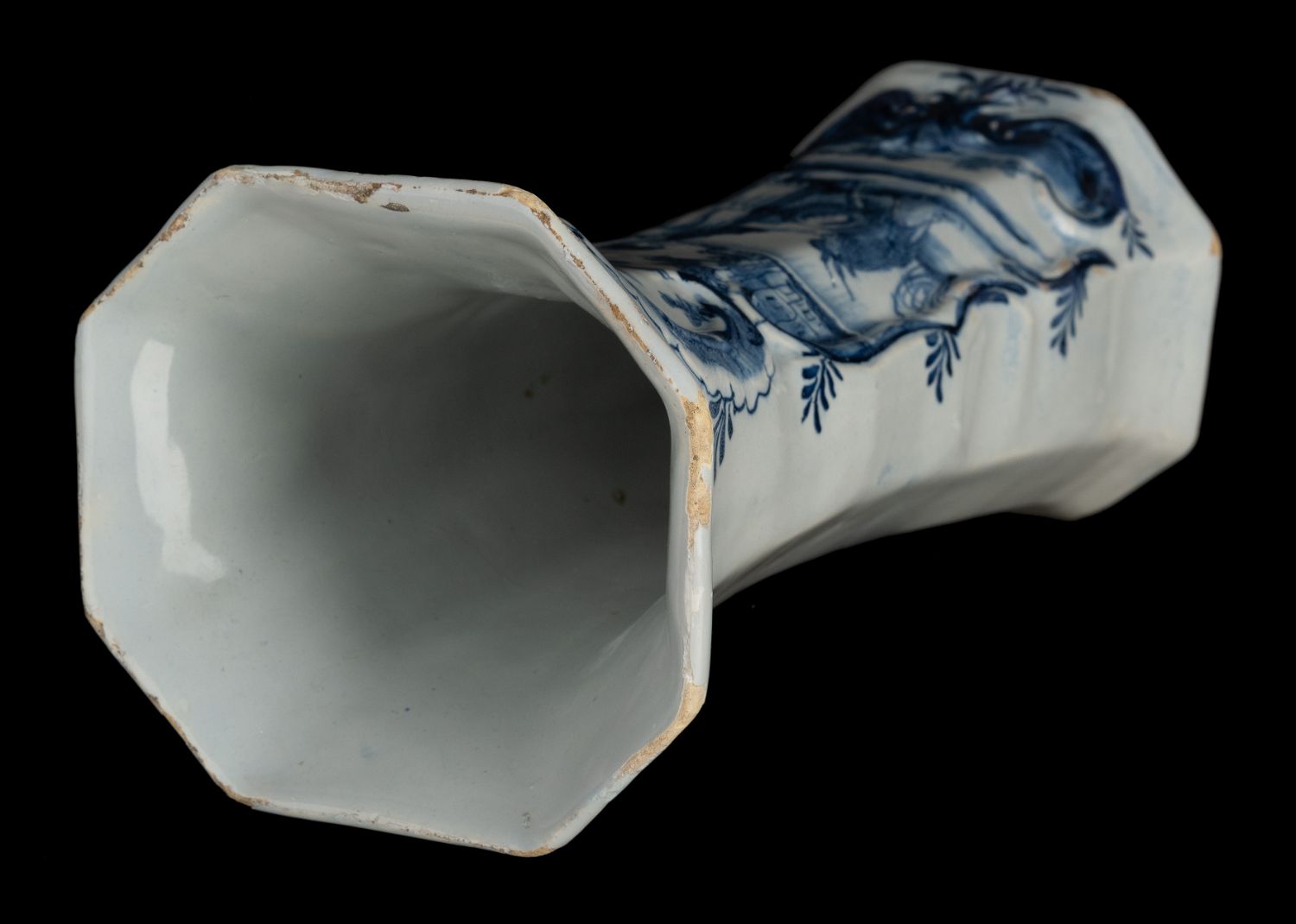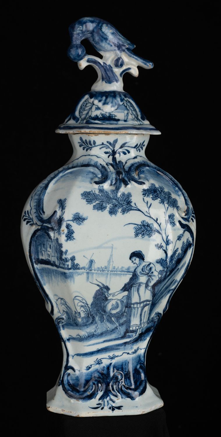 The octagonal garniture consists of three baluster-shaped vases with lids and two beaker vases. The domed lids have a knob in the shape of a berry-eating parrot on a stump. The garniture is painted in blue with a woman and a goat in a water landscape. The decoration is framed by a cartouche of relief-modelled C and S volutes. A flower branch is depicted on the front of the short neck. The back of the vases is painted with a leaf branch.