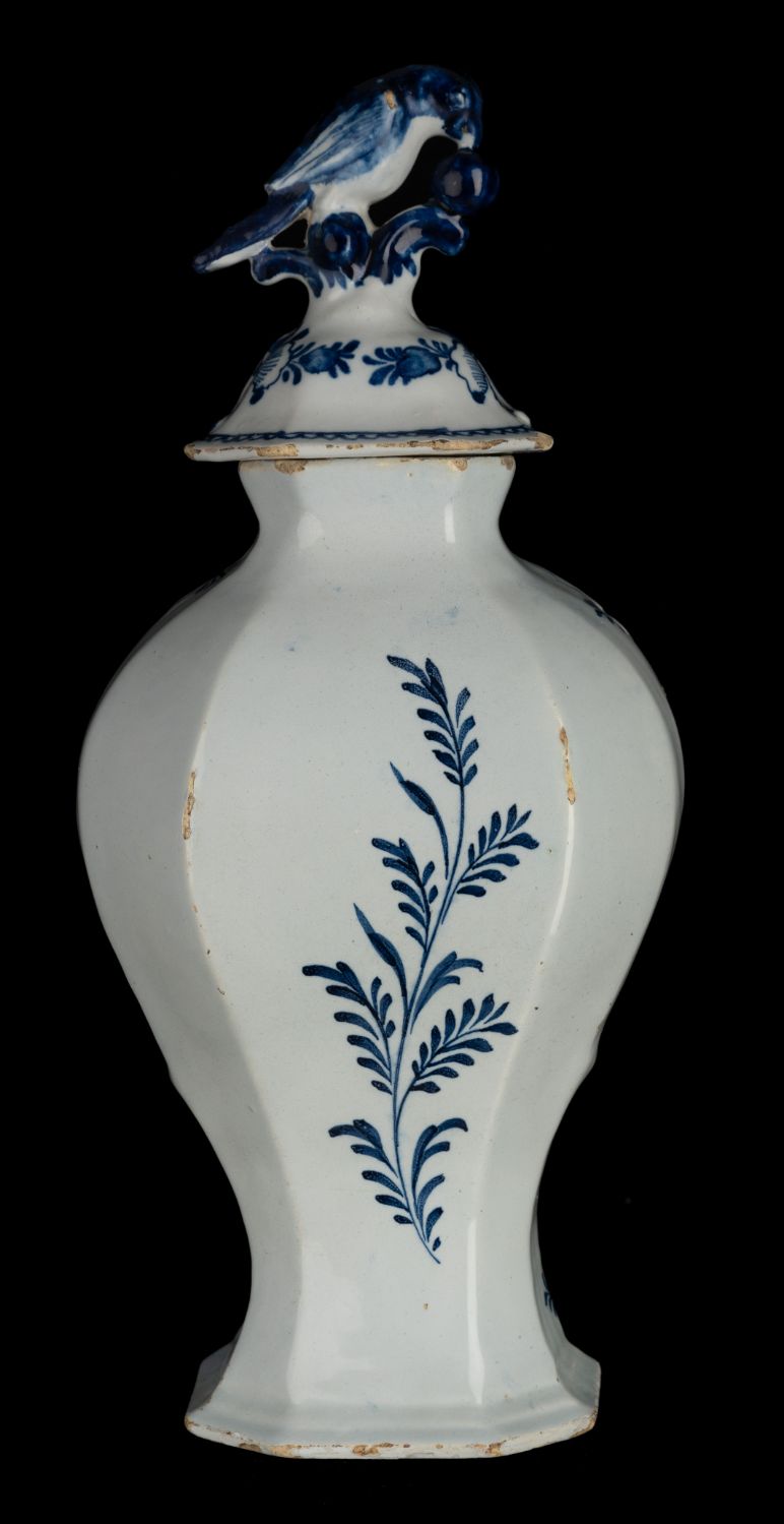 In the second half of the seventeenth century the custom arose of placing vases, bowls and other types of porcelain or Dutch delftware on top of cupboards or above fireplaces. Garnitures – a typically Dutch phenomenon – was developed out of this habit. It consists of a related set of covered jars, beaker vases and in some cases bottle vases, with the same decoration. The first garnitures were made in the 1690s. They remained popular during the entire eighteenth century: garnitures belonged to the standard repertoire of nearly every Delftware pottery.