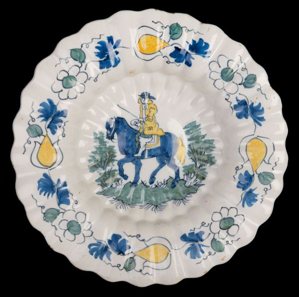 Het kleurschema blauw, geel en groen is in de jaren negentig van de zeventiende eeuw veelvuldig op plooischotels geschilderd, in het bijzonder met vereenvoudigde afbeeldingen van de koning-stadhouder Willem III en zijn gemalin koningin Mary II Stuart. Na de Glorious Revolution in 1688 bestegen zij de Engelse troon in 1689. De meeste plooischotels met dit decor zullen zijn gemaakt rond 1690. Behalve ruiters zijn ook bloemen en vogels, heraldische wapens en landschappen afgebeeld.