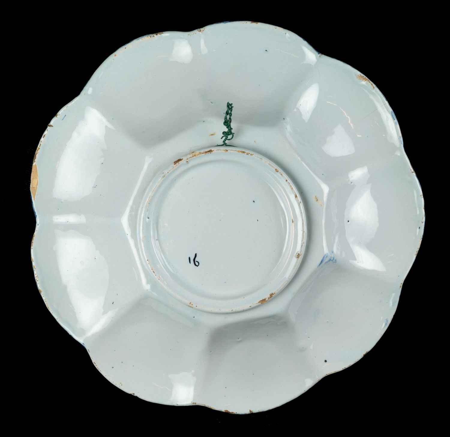 De blauw-witte plooischotel bestaat uit negen enkele, brede plooien rondom een negenkantig plat dat is beschilderd met een chinoiseriedecor, omkaderd door lijnen en een dubbele witte band. In een oosters landschap bevinden zich drie Chinezen, vermoedelijk een vrouw en haar twee bedienden. De ene bediende staat met een vaandel of waaier op een dunne paal in haar hand, de andere zit op de grond. Op de rand zijn vier gelobde ruitvormige cartouches aangebracht, gevuld met een bloem of vlinder. De ruimte daartussen is opgevuld met een bloem op een bed van ornamentkrullen. De buitenrand is egaal blauw. Op de achterzijde is het getal 16 geschilderd.