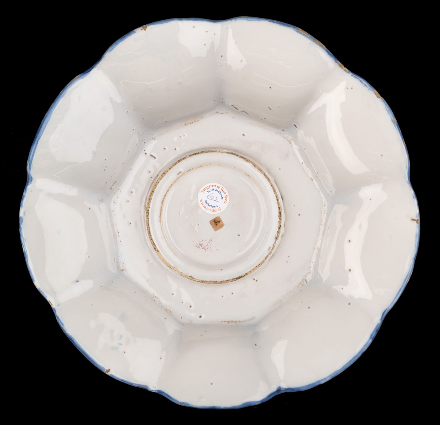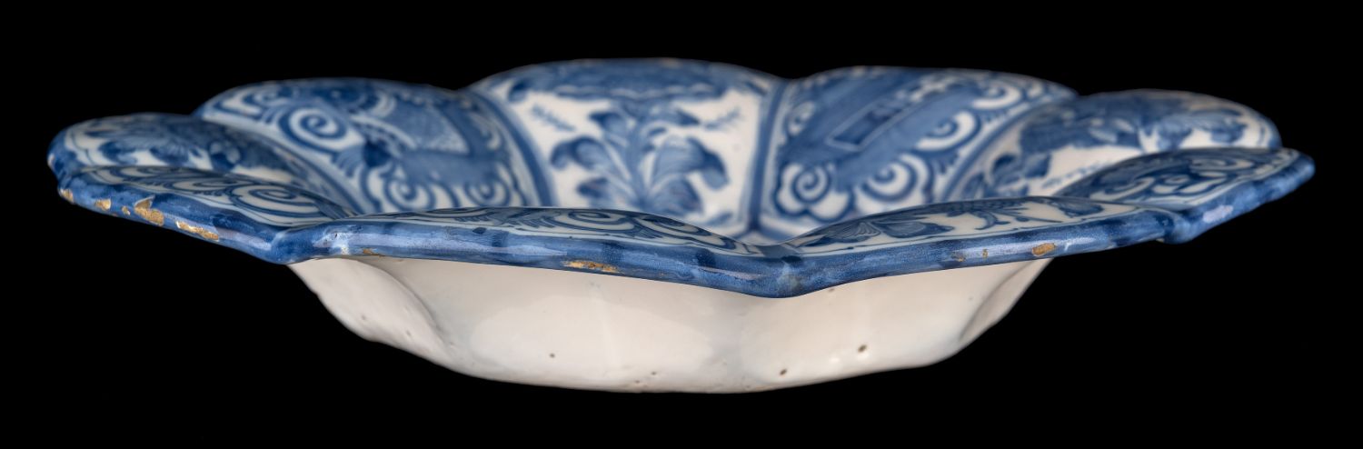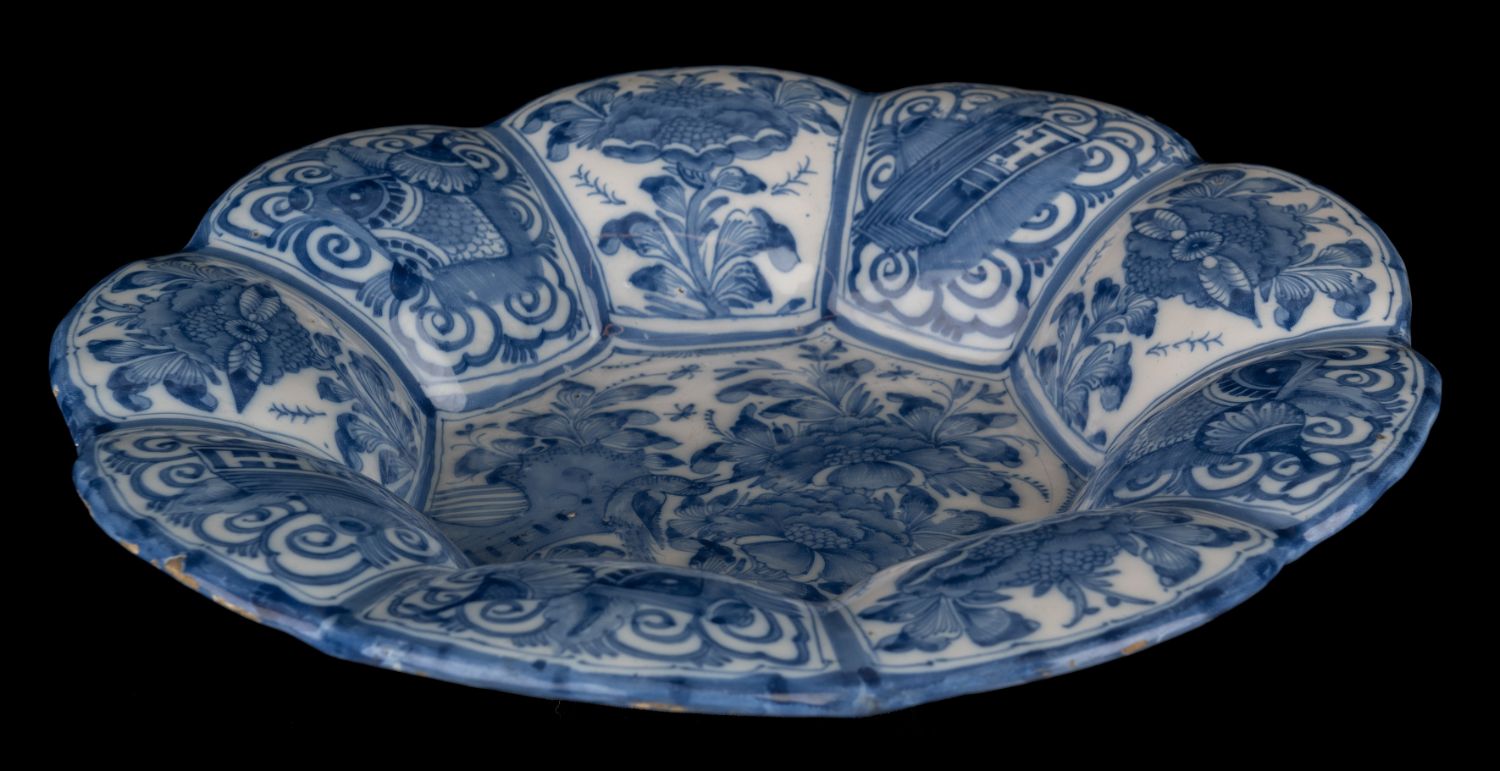 This decor is derived from Chinese kraakporcelain from the first half of the seventeenth century. It was used in many variations on Dutch dishes from Delft and other places, but is rare on lobed dishes. The design and more naturalistic rendering of the flower branches on this lobed dish are otherwise rare on lobed dishes.