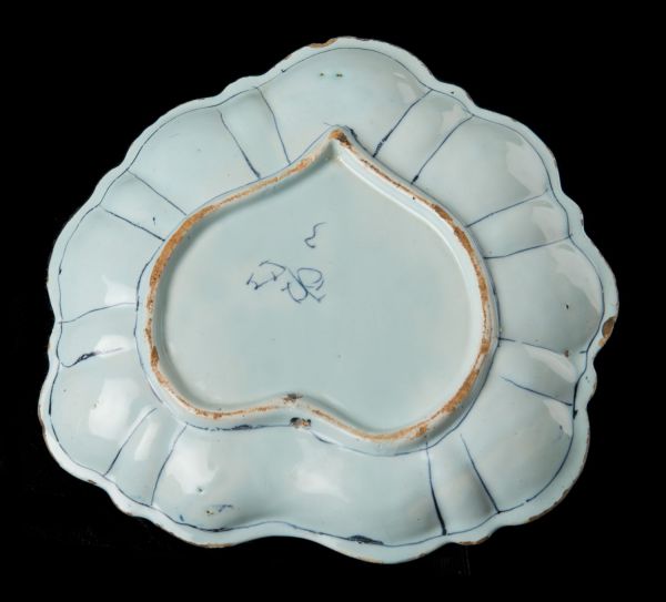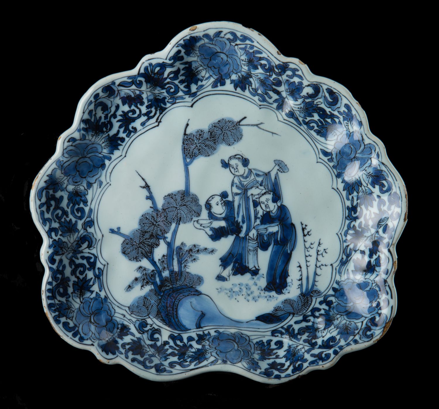 Bladvormige schaal uit een confituurset met geprofileerde opstaande rand, in blauw beschilderd met een chinoiseriedecor. Een Chinese vrouw staat met haar twee dienaren bij een groepje bomen aan het water. De dienaren dragen schalen, de vrouw houdt een waaier beet, ze staan op het punt om een offer te brengen. De voorstelling is gevat in een dubbele lijn. De rand is aan de binnenzijde beschilderd met een doorlopend fries van bloemen en bladranken. De achterzijde is gedecoreerd met acht paren dubbele strepen.