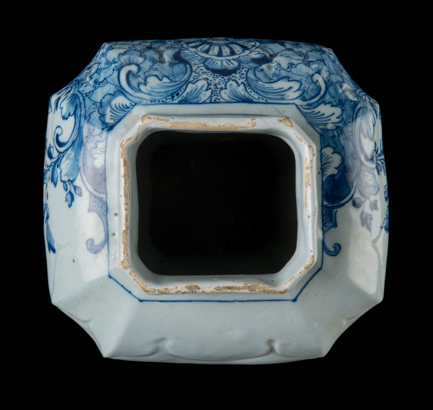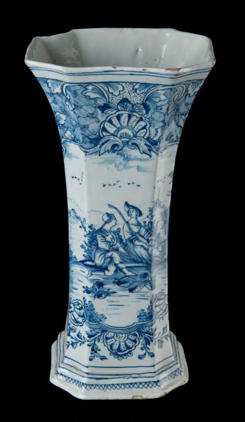 Het kaststel bestaat uit een balustervormige vaas met deksel en twee bekervazen. De vazen zijn vierkant en hebben inzwenkende hoeken. Het bovendeel van het kaststel is in reliëf gevormd en bestaat uit afhangende puntvormen en halve cirkels. Het deksel heeft een balustervormige knop. Het kaststel is in blauw beschilderd met herders in een landschap, gevat in cartouches, opgebouwd uit schelpen, bladeren, voluten en beugels. De cartouches zijn aan de bovenzijde voorzien van Régence-stijl ornamentwerk en aan de zijkanten en onderzijde van bloem- en bladranken. De balustervormige vaas is rondom de hals beschilderd met een krulmotief, op de hoeken zijn vier cirkels aangebracht en op de achterzijde een bladertak. Het deksel is gedecoreerd met ornamenten.