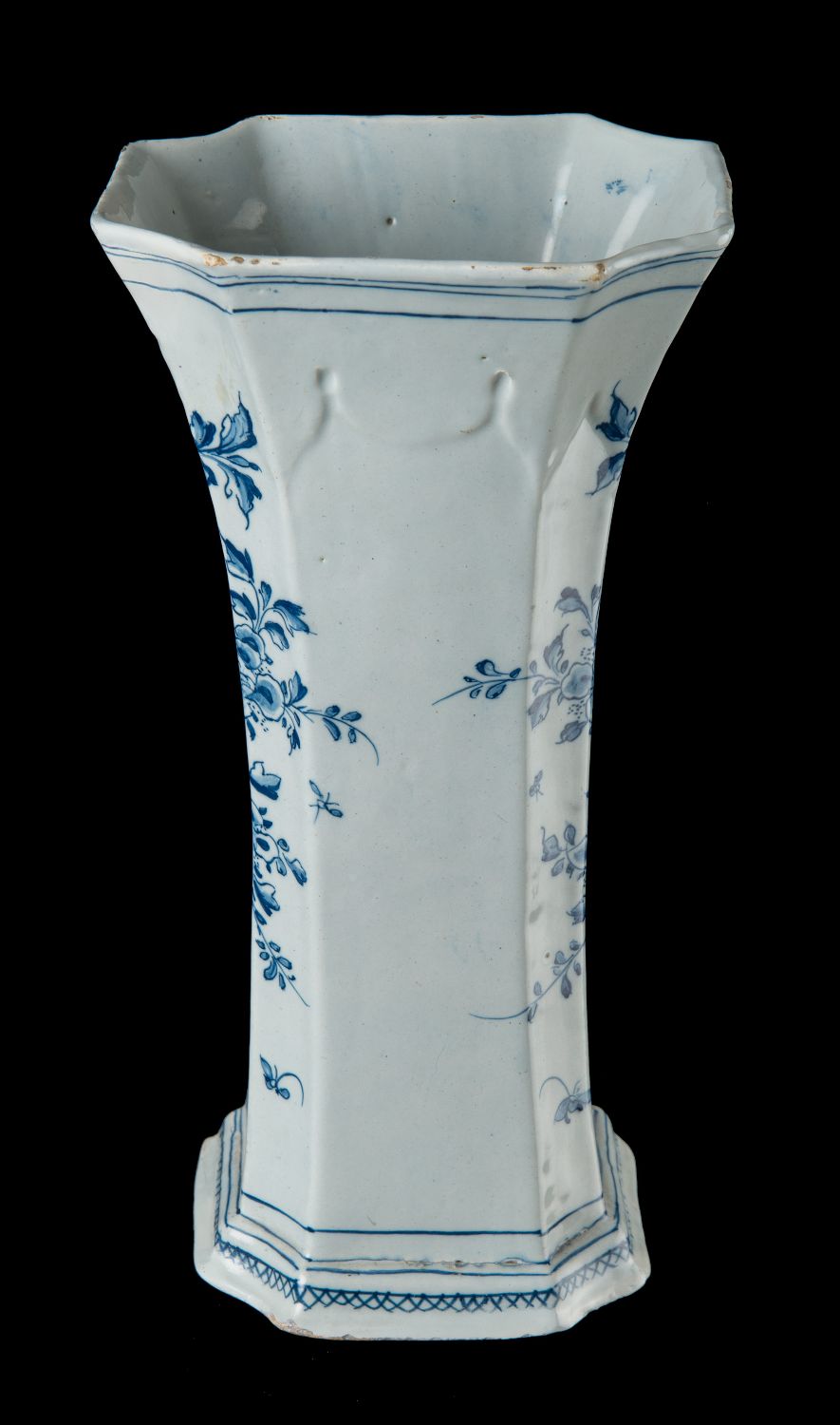 Conditie: Dekselvaas: randschilfers, restauraties aan voet, glazuurbeschadigingen op bolling van vaas; deksel: restauraties aan deel van rand. Bekervazen: randschilfers, restauraties aan voet en rand.
