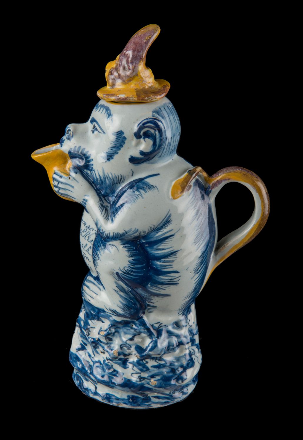 De melkkan heeft de vorm van een drinkende aap, zittend op een gemarmerd voetstuk. De handen en beker vormen samen de schenktuit, op de rug is een handvat aangebracht. De kan is hoofdzakelijk in blauw beschilderd, alleen de schenktuit is in geel uitgevoerd, het handvat en het losse hoofdeksel in geel en bruin. Op de buik van de aap is een rijmpje aangebracht: