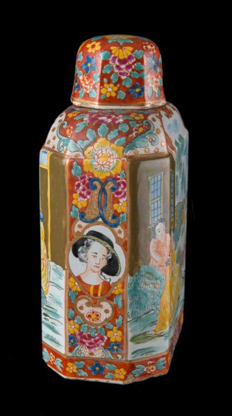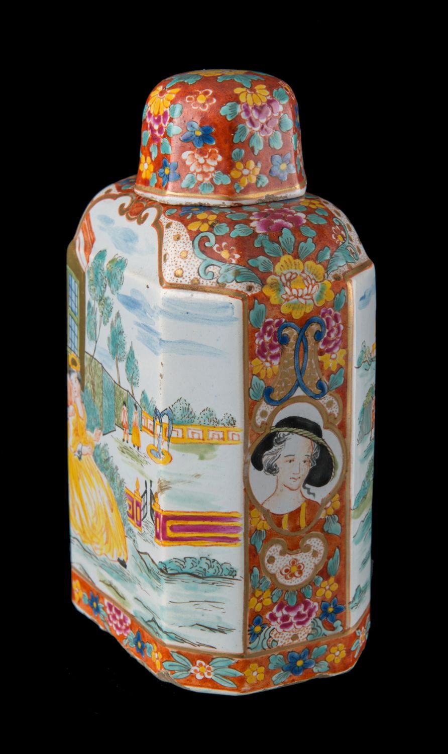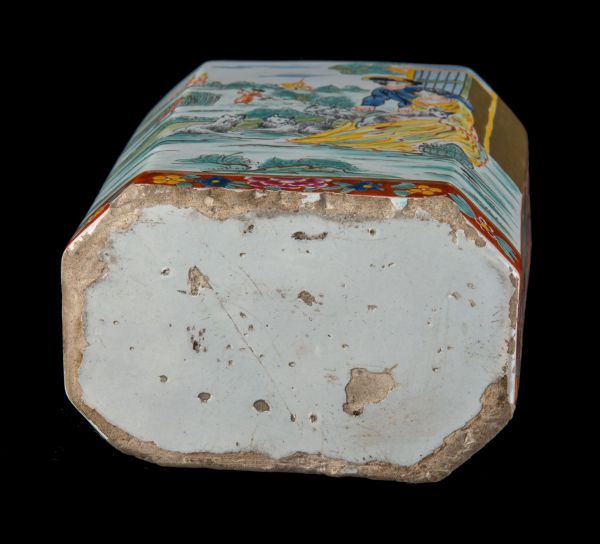 De veelkleurige theebus met deksel heeft een rechthoekig model met afgeschuinde hoeken, de schouders zijn versmallend en afgerond. De hals aan de bovenzijde is rond, het deksel achtkantig. Langs beide zijden zijn twee grote vlakken uitgespaard die zijn beschilderd met galante paren in een landschap. Aan de ene zijde zit een jong echtpaar in een formele tuin aan de achterzijde van een statig landhuis. De jonge vrouw is gekleed in een goudgele jurk. De heer des huizes draagt een rode jas. Aan de andere zijde is hetzelfde - of een ander - paar afgebeeld in een landschap met enkele schapen voor een schuur. De vrouw, eveneens gekleed in een goudgele jurk, heeft een schaapje op haar schoot. Haar man is gekleed in blauw en draagt een baret. Op de achtergrond zijn een boer en boerin aan het oogsten; enkele dorpjes liggen in de verte. De goudgerande omkadering wordt gevormd door bloem- en bladwerk, grotendeels op een bruinrode ondergrond, aan de bovenzijde begrensd door vier vakken met gouden cirkeltjes op een roodgestipte witte ondergrond. Op beide smalle zijkanten van de omkadering zien we een vrouwenportretje in een vierpas, begrensd door C-voluten en cartouches. Op de hals van de theebus is een gouden bies geschilderd. Op het deksel zijn eveneens bloemen en bladeren op een bruinrode ondergrond aangebracht. Afmetingen: hoogte 16,5 cm, lengte 9,5 cm, breedte 6,5 cm