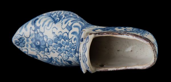 De schoen heeft een afgeronde neus en een hoog voorblad dat eindigt in een kleine strik. Hij is rondom in blauw beschilderd met een decor van gekrulde bladeren en druiven. Op het voorblad bij de neus van de schoen is een bloemmotief aangebracht. Op de hiel, zijkanten en langs de rand van de zool is imitatie-stiksel aangebracht. De schachtrand, de hak en de rand van de zool zijn in paars en blauw uitgevoerd.