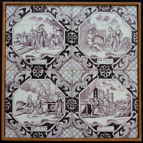 Een blok van vier Antieke Tegels met Bijbelse voorstellingen gemaakt in Utrecht aan begin van de negentiende eeuw. De uitvoering van de voorstelling alsmede de omlijsting van achtkant met lof is in paars uitgevoerd. Afgebeeld zijn de volgende voorstellingen: Richteren 17v9 En er was een man van het gebergte van Efraïm, wiens naam was Micha; Job 1V5 Job’s brandoffer; Richteren 11v39 Jetfa’s dochter geofferd; Job 2v11 Job en zijn vrienden.