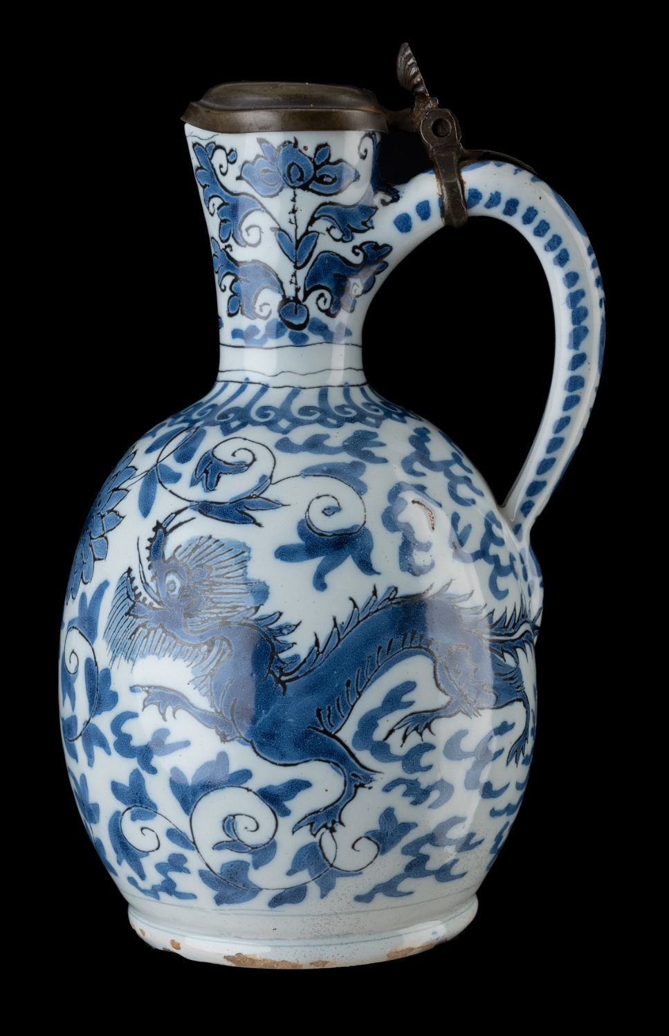 De wijnkan heeft een eivormig lichaam op een licht ingesnoerde voet, een korte hals met uitkragende schenklip, een handvat, en een tinnen klepdeksel. De kan is in blauw beschilderd met een centraal decor van een grote bloem, geflankeerd door twee draken op een grond van bladranken en gestileerde wolkmotieven. Op de schouder is een band met krulmotieven aangebracht onder een dubbele cirkel. Op de hals zijn twee gestileerde bloemen geschilderd, op het handvat stippen, strepen en krullen.
