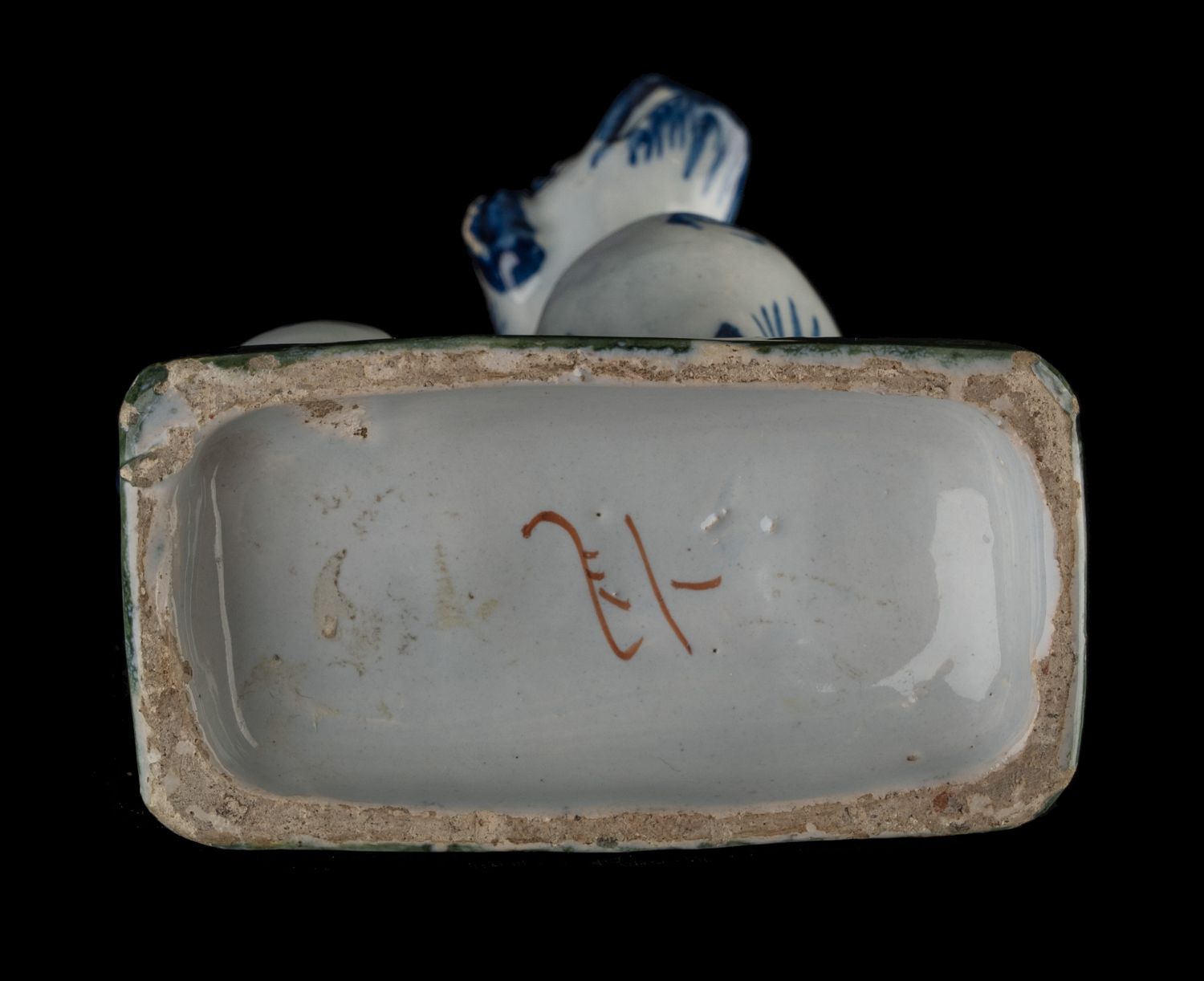 De zittende hond is gemodelleerd en geplaatst op een rechthoekig voetstuk. Hij heeft zijn kop opgeheven en gewend, en zijn bek is geopend. De hond is blauw beschilderd en draagt een bruin-gele halsband. Op het groene voetstuk is in paars een krullende rank geschilderd.