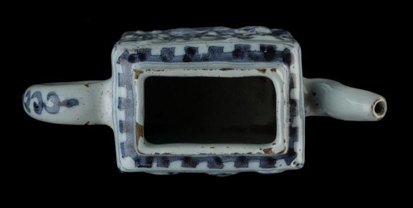 De in blauw beschilderde schenkkan of theepot heeft een rechthoekige vorm en een smalle schouder die eindigt in een smallere rechthoekige opening aan de bovenzijde. Het oorvormige handvat eindigt in een krul, de schenktuit heeft een afgeplatte s-vorm. Op de zijkanten is een decor in reliëf gemodelleerd en geschilderd. De ene zijde toont een vrouw die vruchten plukt uit een bloeiende boom, de andere een rustende herder met een kalebas onder een fruitboom. Op de korte zijden en het handvat zijn krulornamenten aangebracht. Aan de onderzijde van de tuit is een tulp geschilderd. De schouder is versierd met een bloklijn. Aan het tinglazuur is een kleine hoeveelheid kobaltoxide toegevoegd waardoor het een licht blauwige toon heeft gekregen.