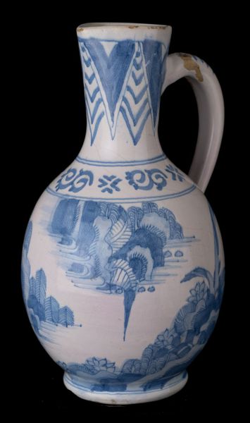 De wijnkan met eivormig lichaam staat op een korte voet en heeft, een korte hals met uitkragende schenklip en een oorvormig handvat dat eindigt in een punt. In het handvat is aan de bovenzijde een gat voor het monteren van een deksel aangebracht. De kan is in blauw beschilderd met twee Chinezen in een oosters rotslandschap. De schouder is versierd met een band met ornamentkrullen en kruisvormen. De hals is voorzien van twee typen puntornamenten, het handvat met krulornamenten en strepen.