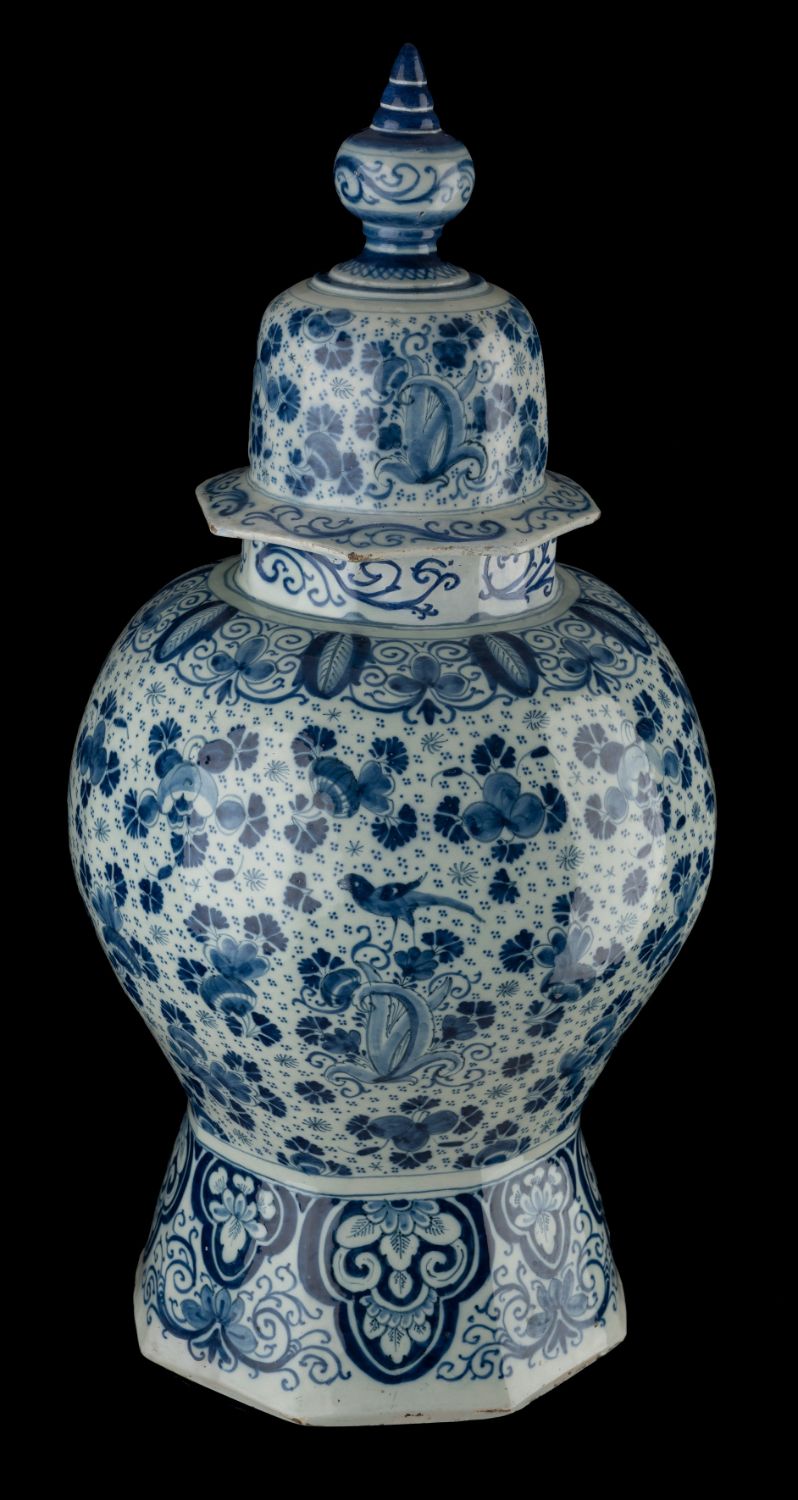 Het driedelige kaststel is achtkantig en bestaat uit een balustervaas met deksel en twee knobbelvazen. Ze staan op een hoge, ingesnoerde voet. Het kaststel is in blauw beschilderd met florale motieven en ornamenten. Rondom de buik van de vazen is een levendig decor met bloemen aangebracht, op de schouder begrensd door een band met gestileerde bladeren en ornamenten onder een witte band. In het bloemdecor is een bladvormig element met vogel geschilderd dat als een monogram VD of DV kan worden geïnterpreteerd. Het bloemdecor versiert het deksel van de balustervaas en beide halzen van de knobbelvazen. Op de rechte hals van de balustervaas en op de buitenzijde van de twee trompetvormige monden van de knobbelvazen zijn takachtige krulornamenten aangebracht. De voeten van het kaststel zijn alternerend gedecoreerd met vier grote en vier kleine palmetten en bloemen met krulornamenten. De palmetten zijn gevuld met florale motieven.