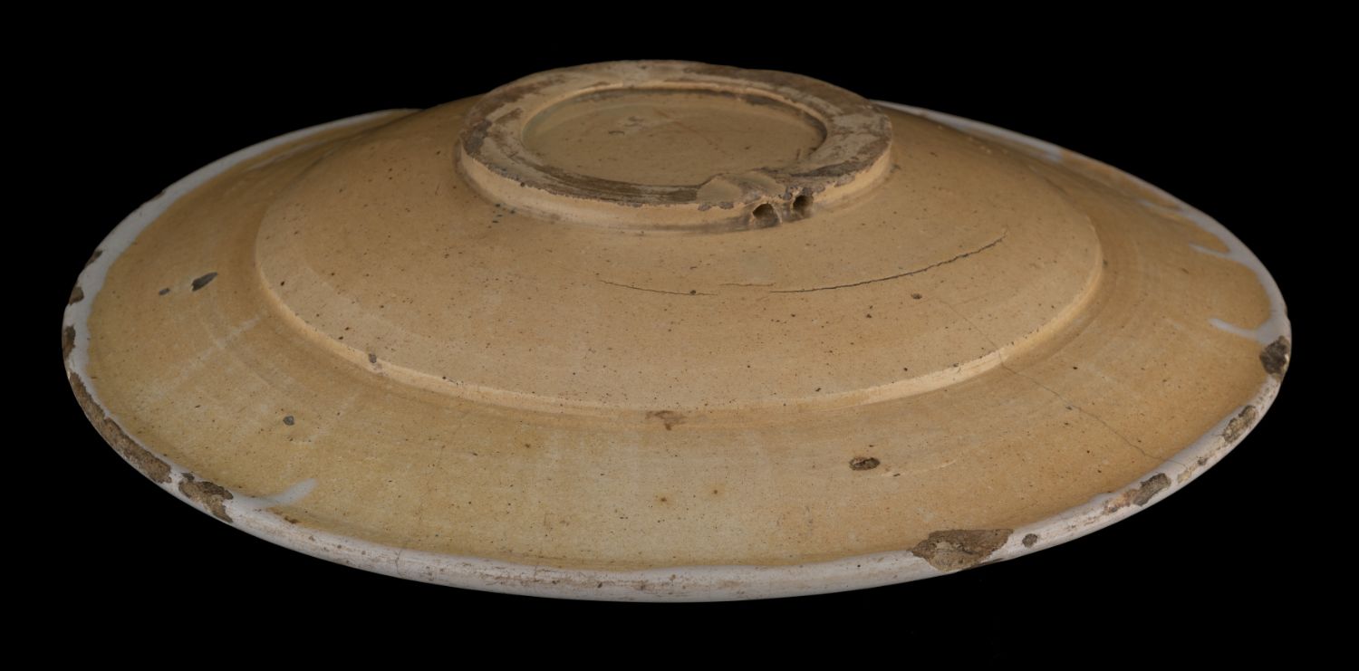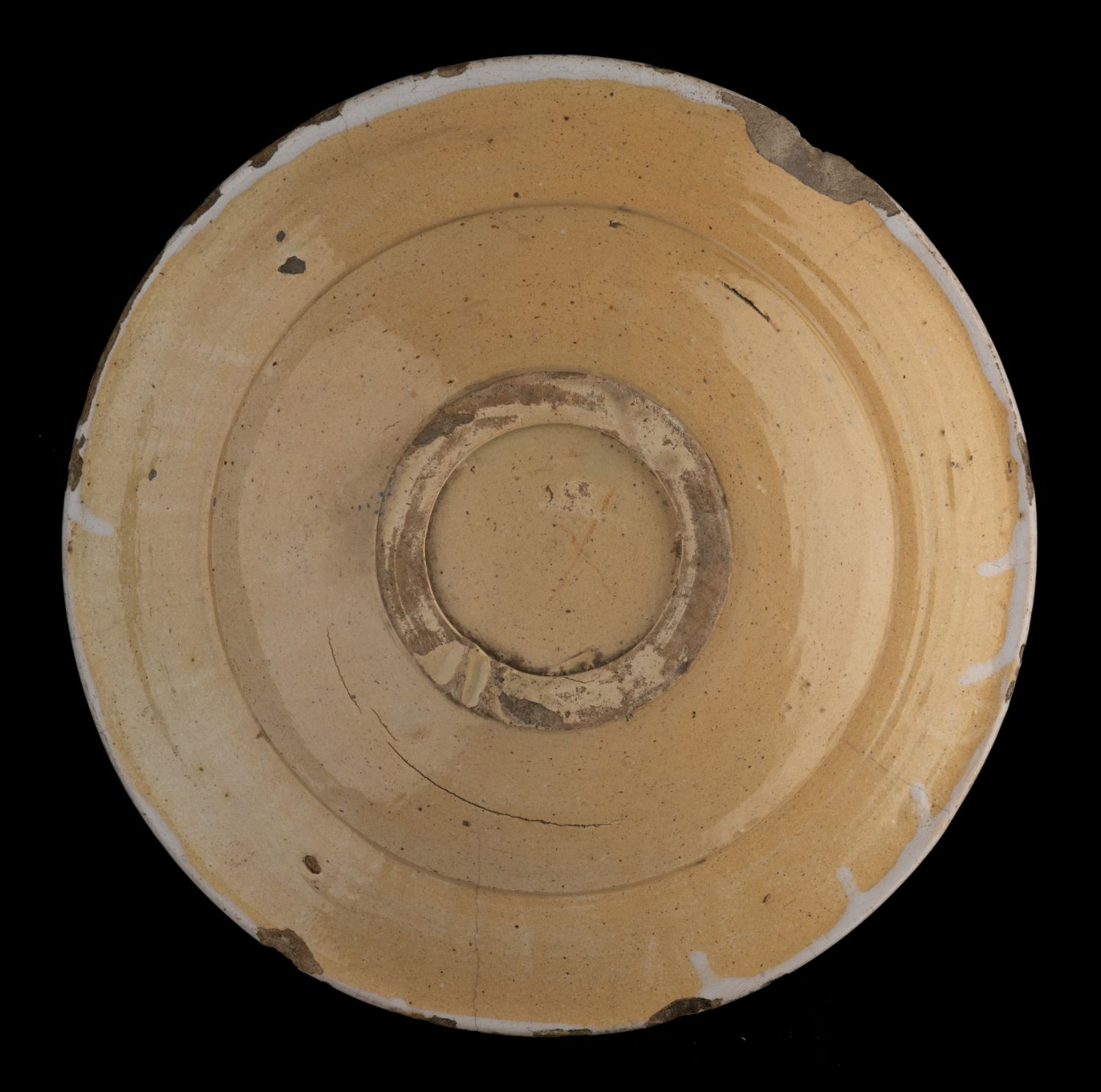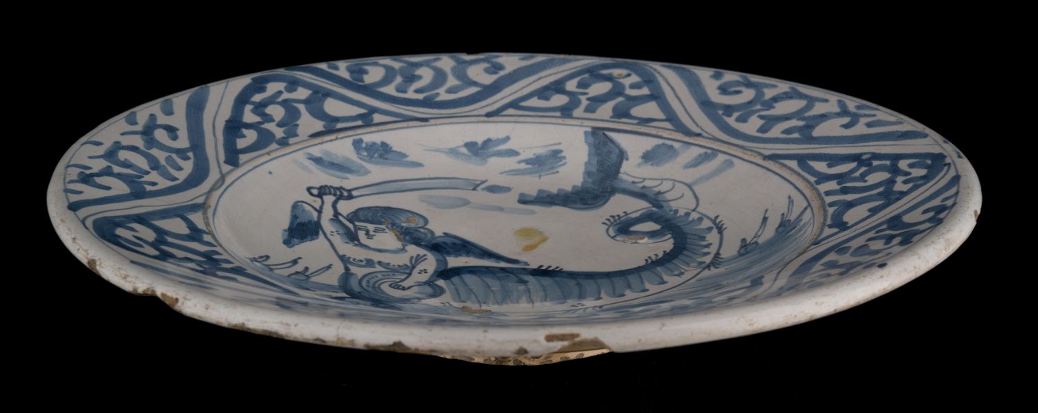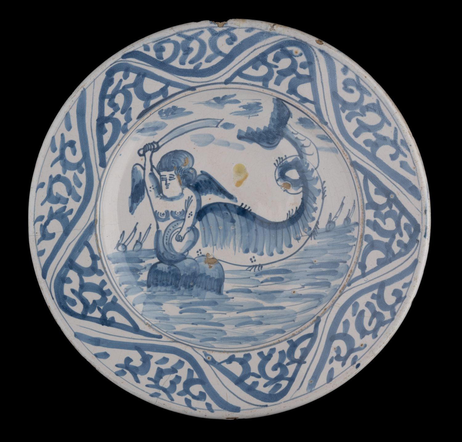 De blauw-witte schotel heeft een brede, spreidende rand en is in het plat beschilderd met een gevleugelde triton met zwaard en schild. Het wezen zit op een rots in het water. Op de achtergrond varen schepen aan de horizon. Op de rand is een vijfpuntig element aangebracht op een grond van krulornamenten. In het plat zijn drie, voor majolica kenmerkende, proensporen zichtbaar.