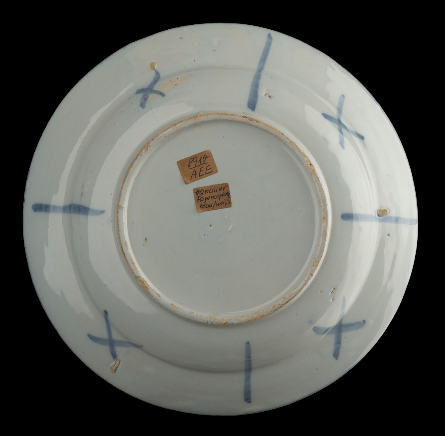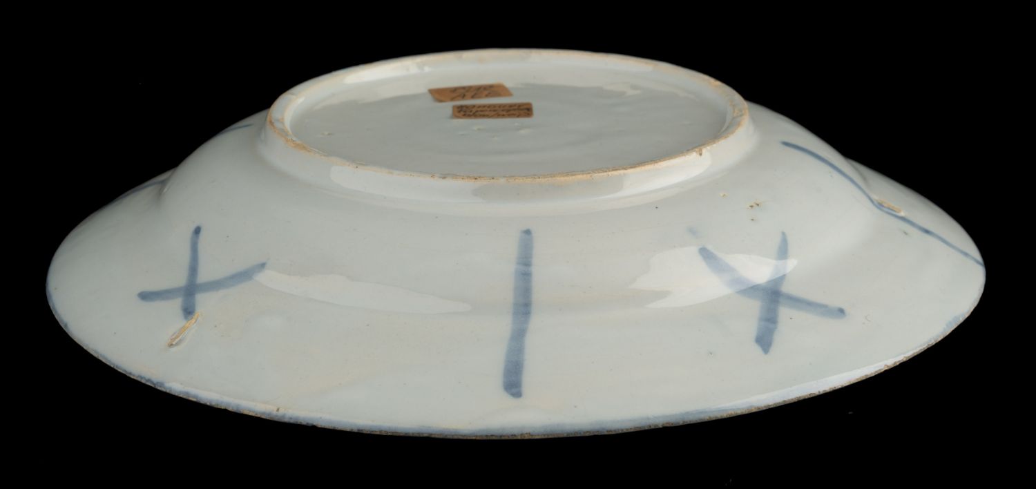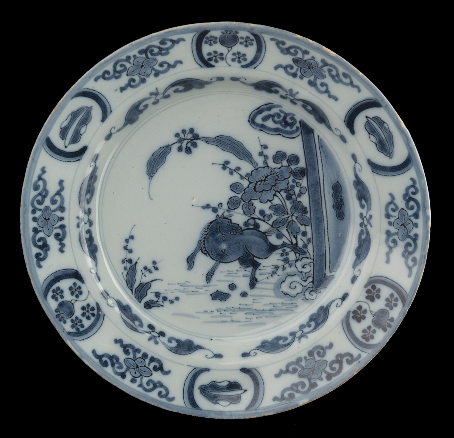 Het blauw-witte bord heeft een vlakke rand en is beschilderd met een chinoiseriedecor. In een oosters tuinlandschap springt een achteromkijkend paard tevoorschijn uit struikgewas naast een schutting of paneel. Op de vertreding zijn zes dubbele bladmotieven aangebracht. Op de rand zijn zes cartouches geschilderd, afgewisseld met een bloem met krulornamenten. De cartouches zijn om en om gevuld met een blad of vrucht. De buitenrand is in blauw. Aan de achterkant zijn strepen en kruizen aangebracht.