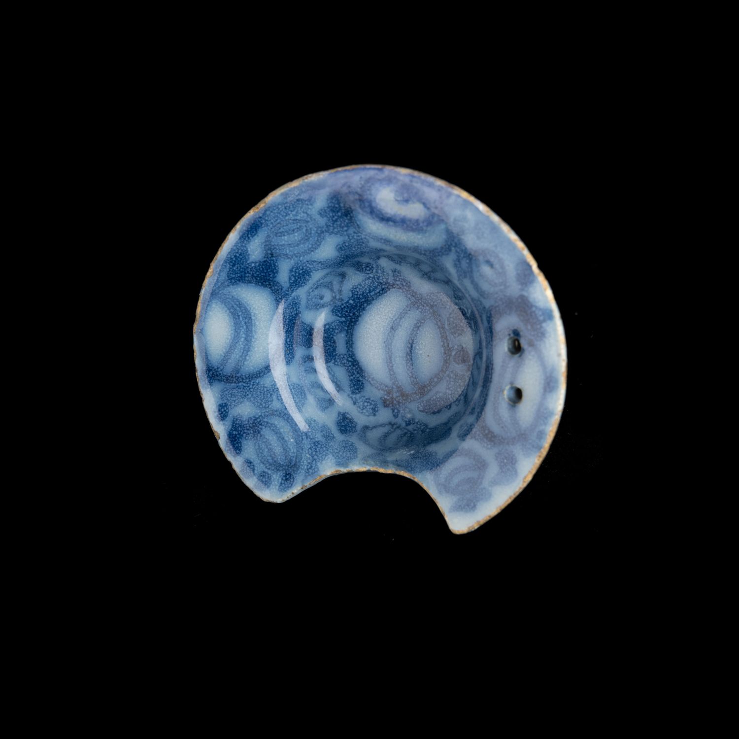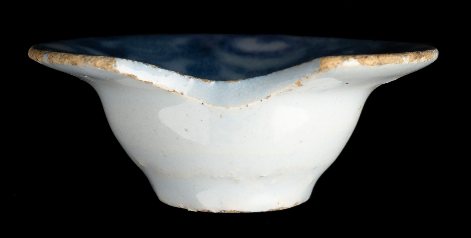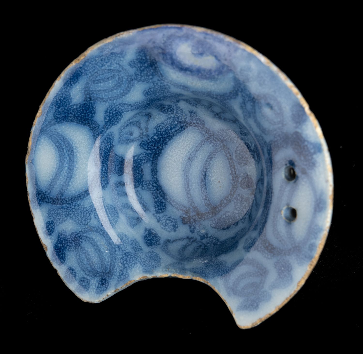 The miniature shaving bowl has a wide, flat rim with a semi-circular recess. Two holes have been made in the rim for hanging. The shaving bowl is painted blue.