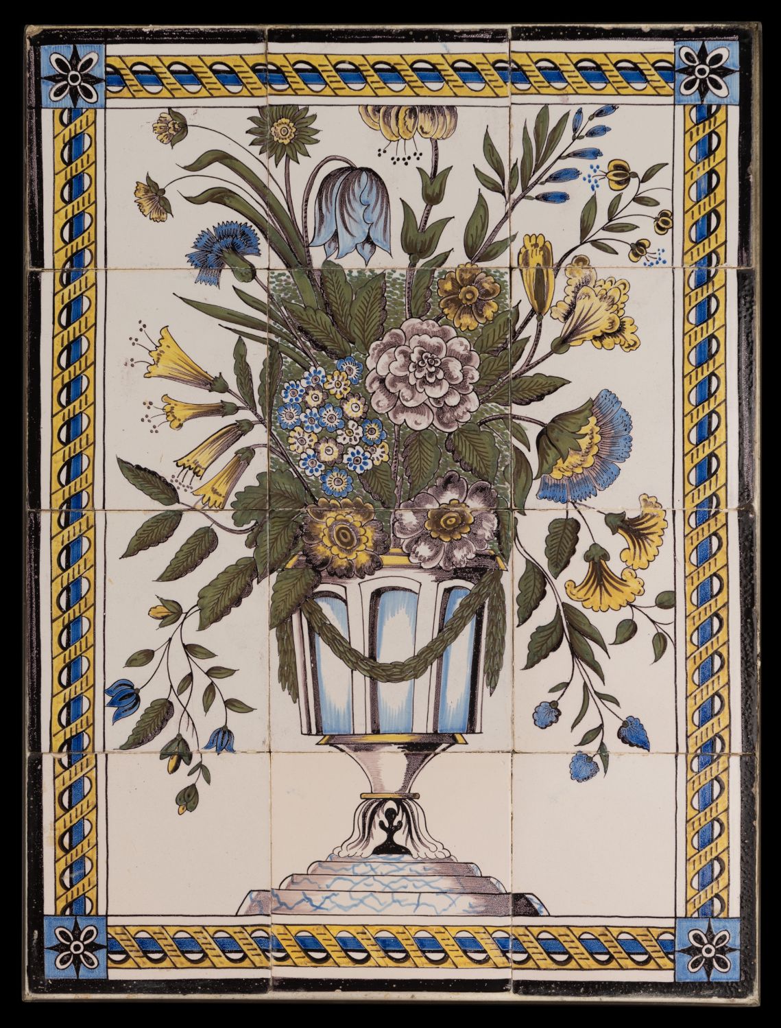 Tegeltableaus met bloemenvazen zijn gedurende de hele achttiende en een groot deel van de negentiende eeuw gemaakt in Nederlandse tegelbakkerijen. Tegeltableaus werden vaak toegepast in haarden, zowel in het onderste deel waar gestookt werd als in de boezem boven de mantel. Kleinere tableaus van vier of zes tegels werden vaak symmetrisch in tegelwanden opgenomen. Behalve bloemvazen werden ook honden, katten, paarden, koeien en vogelkooien in dergelijke wanden opgenomen.