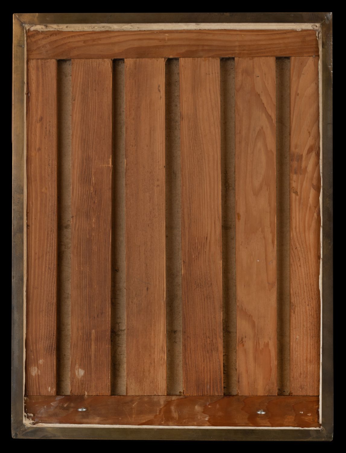 Afmetingen: hoogte 54 cm, breedte 40 cm, dikte 3,2 cm. Het tableau is gemonteerd op hout in een messing lijst.